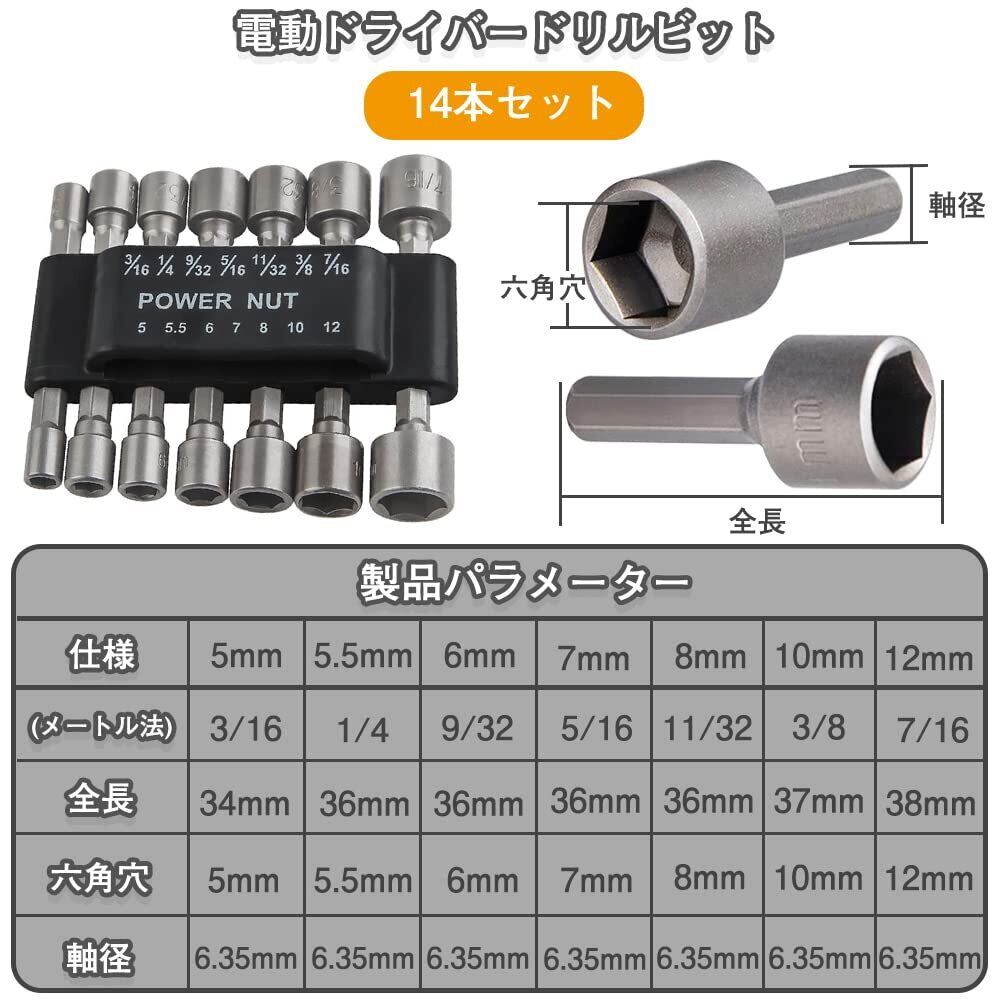 電動ドライバードリルビット ソケットスリーブ 六角ビット 1/4インチソケットセットドライバ ドライバー ソケットビット クロムバナジウム鋼 取り付け/取り外し 電動工具 ドリル ビット アダプター 家庭用DIY/プロの機械修理使用 (14個セット (六角軸径3/16-7/16 5-13mm))