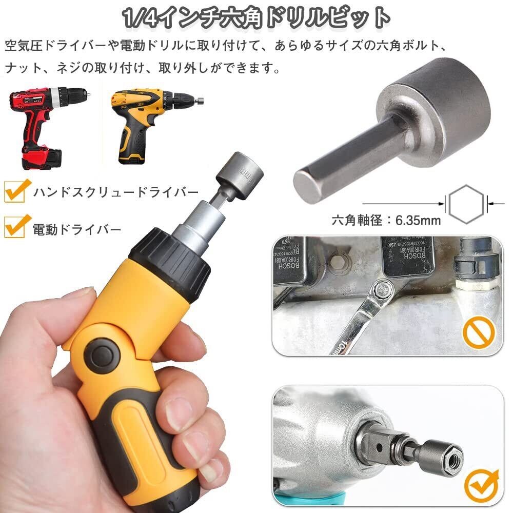六角軸径:6.35mm(1/4インチ)、エアードライバーや電動ドリルに装着して、あらゆるサイズの六角ボルト、ナット、ネジの取り付け、取り外しが可能。