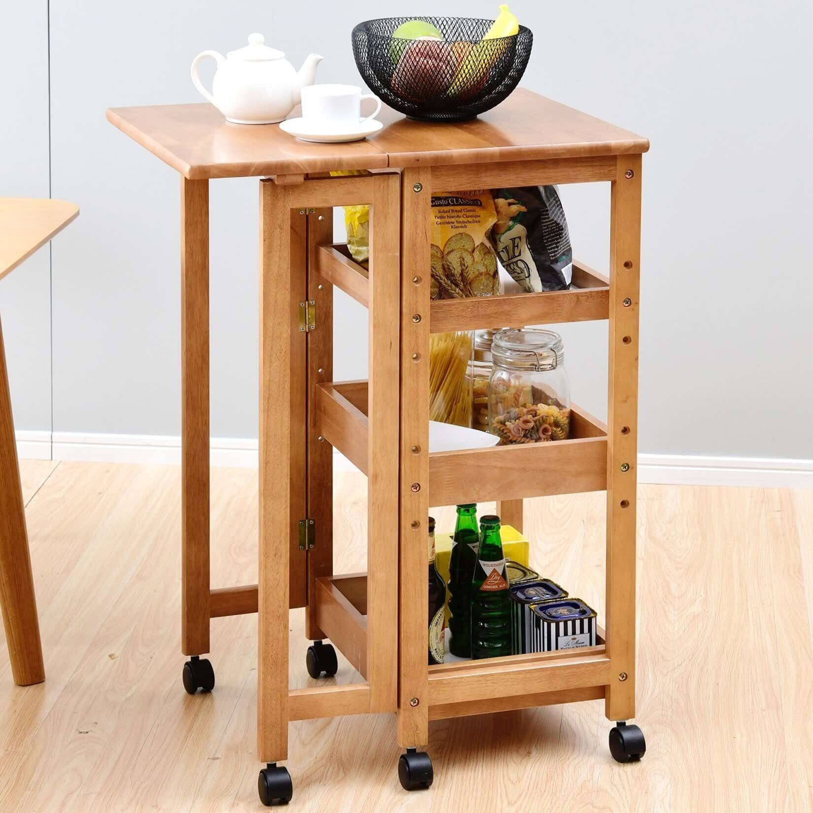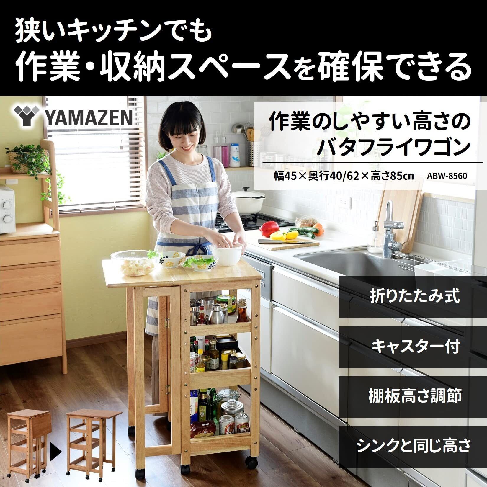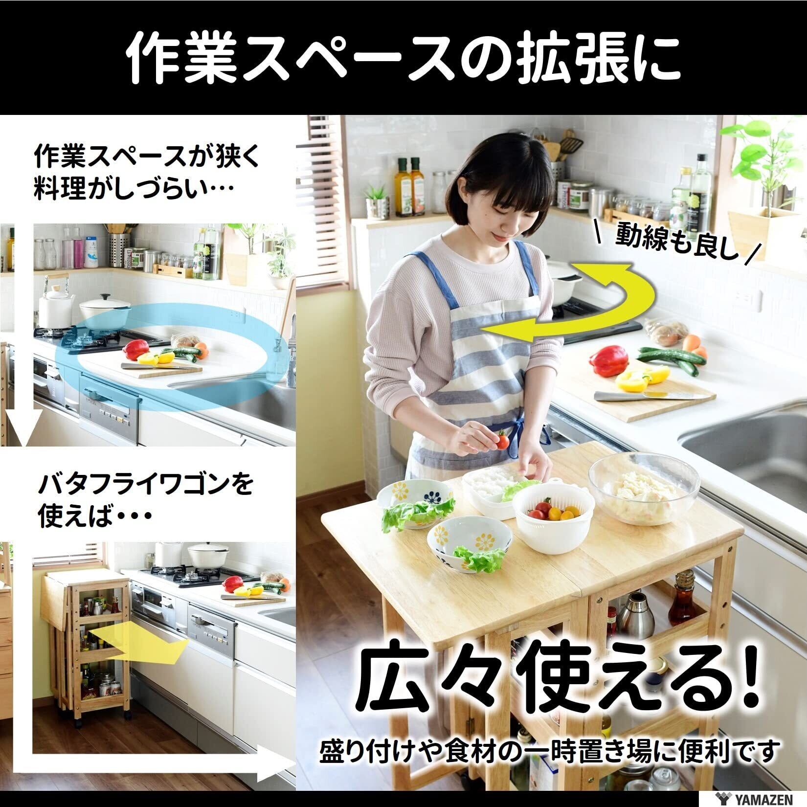 【作業台になるキッチンワゴン】キッチンの作業スペースが少なくてお困りの方にオススメなのが、山善の「作業のしやすい高さのバタフライワゴン」。一般的な流し台と同じ高さの高さ85㎝の作りで、キャスターも付いているので、使いたい時はキッチンに寄せて作業台として使うことができます。