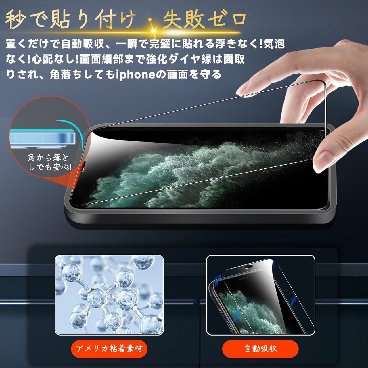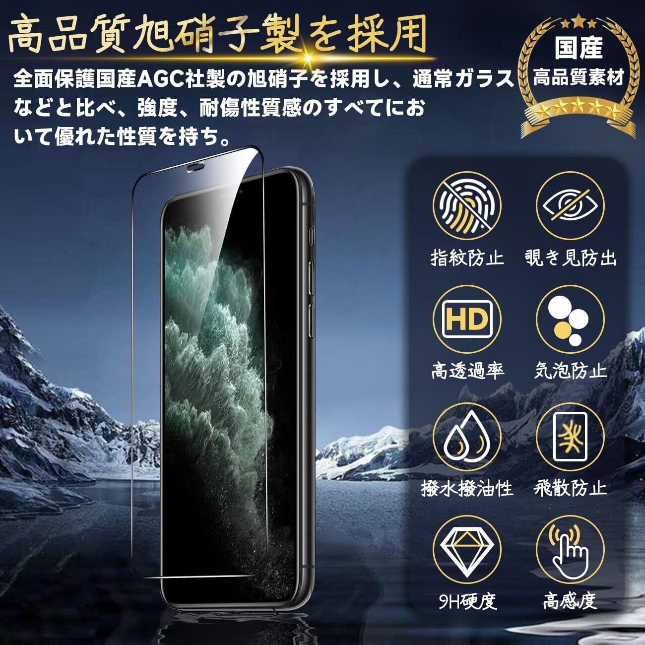 特徴 ⓵国産AGC製素材旭硝子製 ⓶9H硬度 ⓷指紋認証鋭敏、指紋防止良い効果 ⓸気泡なし 極薄 ⓹高光沢仕様 ⓺ 簡単貼り付け 自動吸着⓻飛散防止