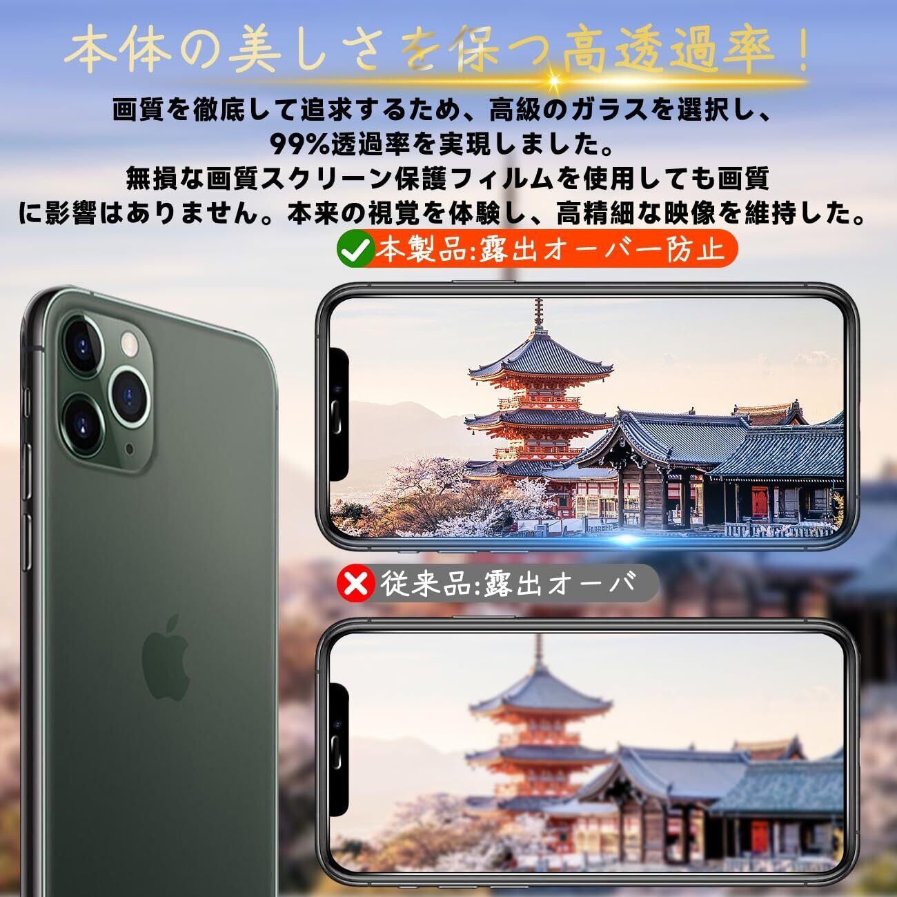 【超高透過率】新しいアップグレードした光学プロジェクション技術を使って、液晶画面保護ガラス フィルムを改良した後、約99.9%高い光線透過率に達し、より高い光透過率と超クリアな視覚体験を実現します。しかも液晶画面の本来の美しさにも影響しません。高精細度でいつでも写真やビデオをきれいに撮影することが可能です。