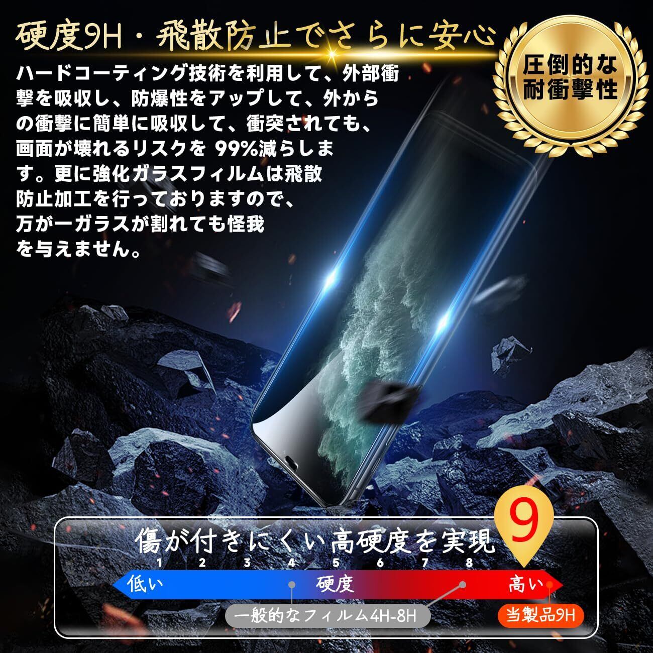 【高品質の材料の9H硬度】とレンズ保護フィルムはすべて旭硝子で作られており、スマホ保護フィルムの中で最高レベルの9H硬度に達しています、4.5時間以上の高温焼入れ処理を行い、スクリーンプロテクターの圧強度は 125mpa に達し、通常 ガラス の 5 倍になりました。しかもスクリーンプロテクターは衝撃を抑えるシリコンコーティングを内蔵しており、万が一ガラスが割れても、ガラスの破片が飛散しません。ハードコーティング技術は、衝撃を最小限に抑えて画面の破損を抑え、すり傷防止や指紋防止もしっかりとスクリーンを保護します。*大切な携帯電話の液晶画面を保護し、衝撃や表面のキズを防止します。