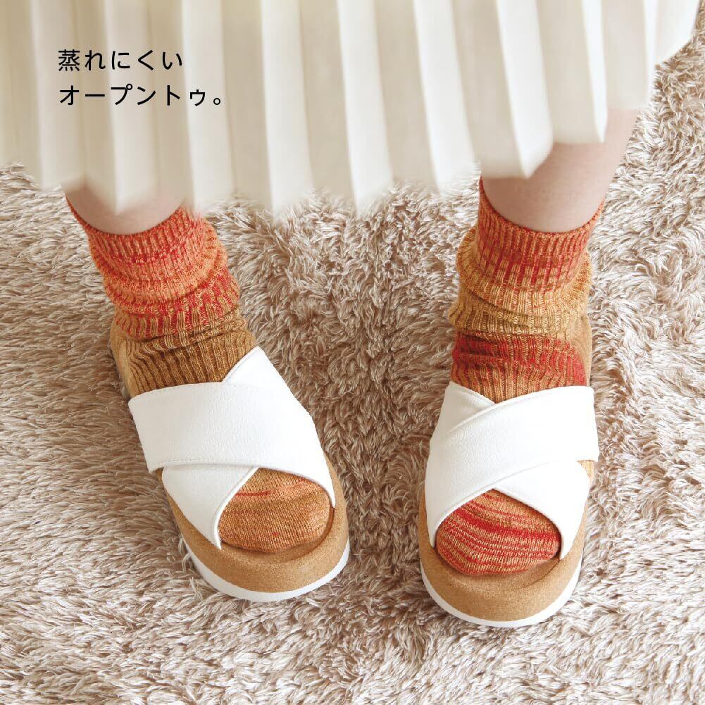 蒸れにくいオープントゥタイプなので夏場でも快適。立体インソールが足にフィットし脱げにくく、かかとに弾力性があり軽量で快適な履き心地です。底面にはすべり止め付き。