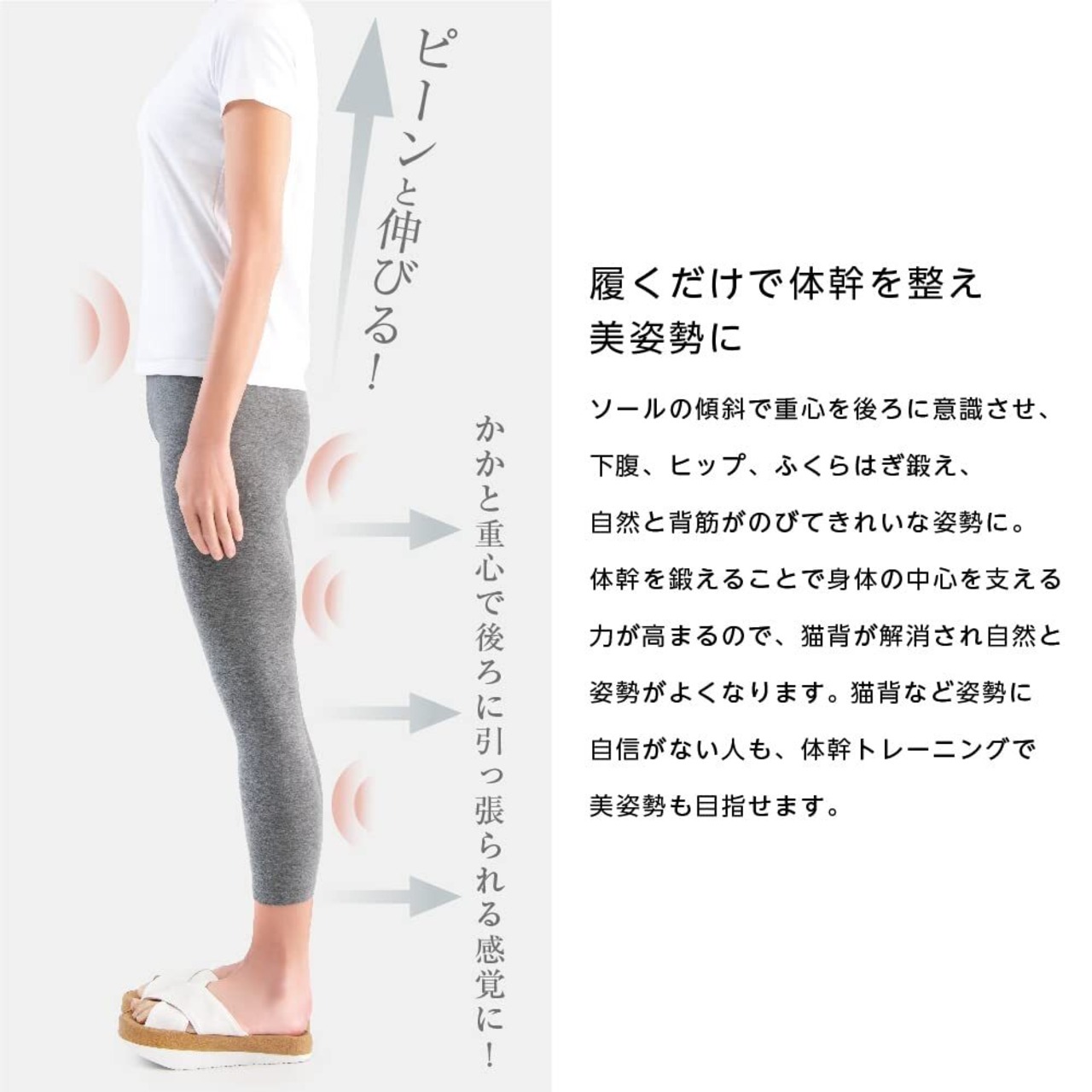 ソールの傾斜が、体の重心を後ろに意識させることで、下腹、ヒップ、ふくらはぎにキュッと力が入り正しい姿勢に導きます。