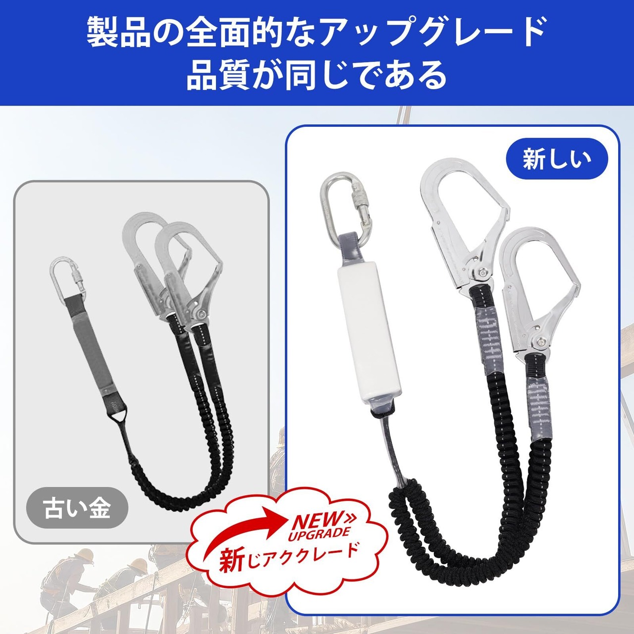 【高品質素材フルハーネス新規格セット】高強度ポリエステル素材の安全帯本体は軽量で耐久性に優れており、傷がつきにくい。調整バックルやフックはステンレス鋼素材で強く引っ張っても問題なし!使用可能質量:100kg以下。ショックアブゾーバ種別:第一種(4kN)、最大自由落下距離:1.8m。