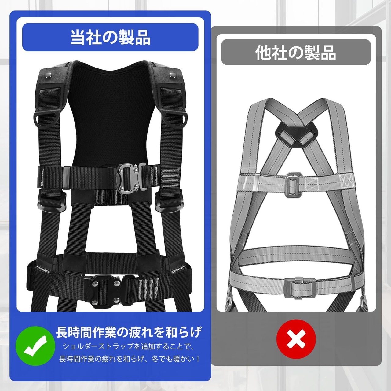 【ご注意】高所作業やクライミングなどは非常に危険ですので、ご自身の安全のために、事前に当該業務に関する安全又は衛生のための特別の教育を受けてからフルハーネスをご使用ください。使用方法や定期点検に不適切な点がありましたら、重大な事故につながる可能性があるので、ご注意ください。弊社では常に高品質の製品や良いサービスを提供することを心がけております。お客様のニーズにより適したサービスを提供するために、ぜひメールでご意見をお聞かせください。