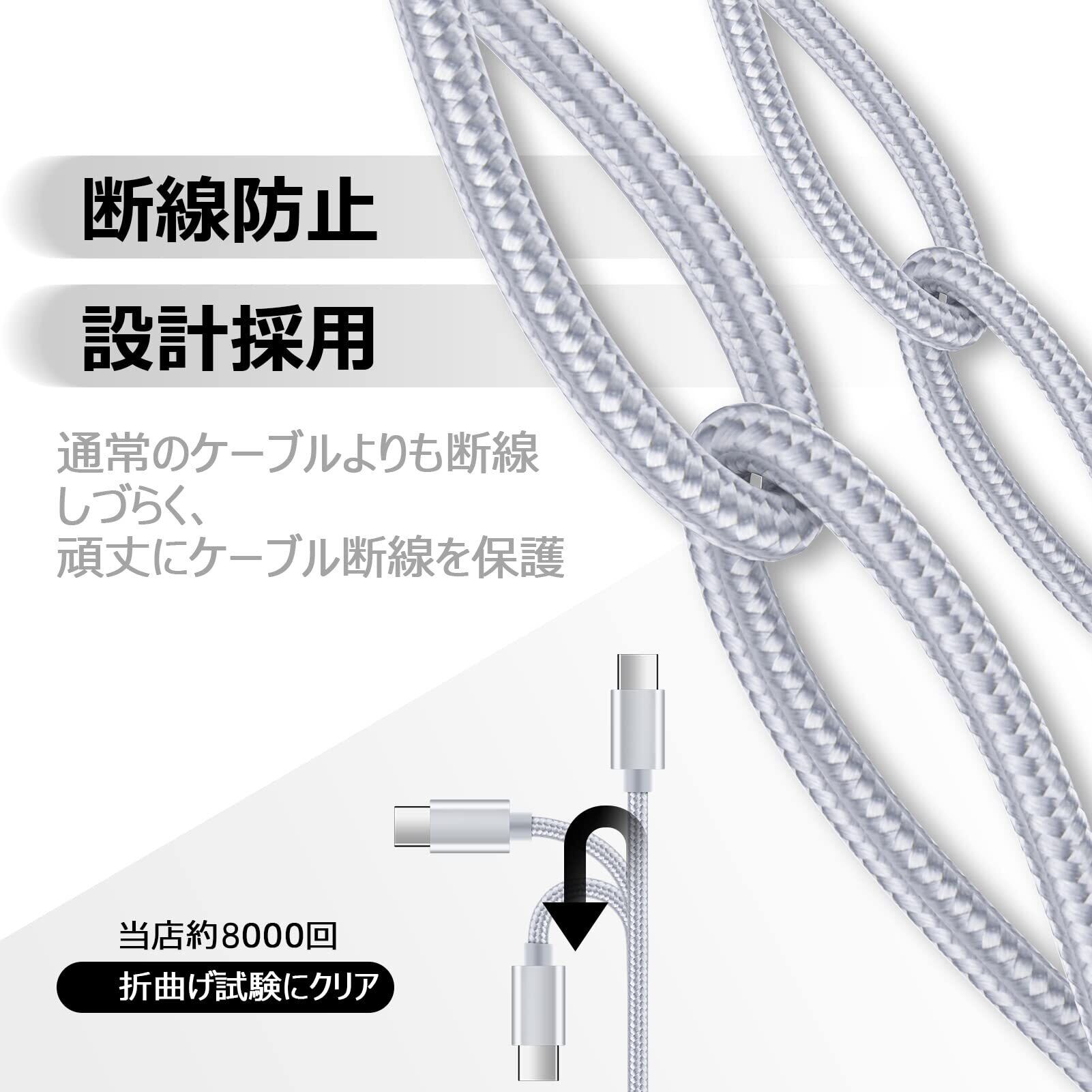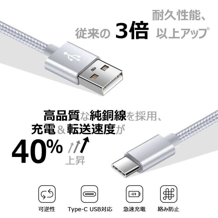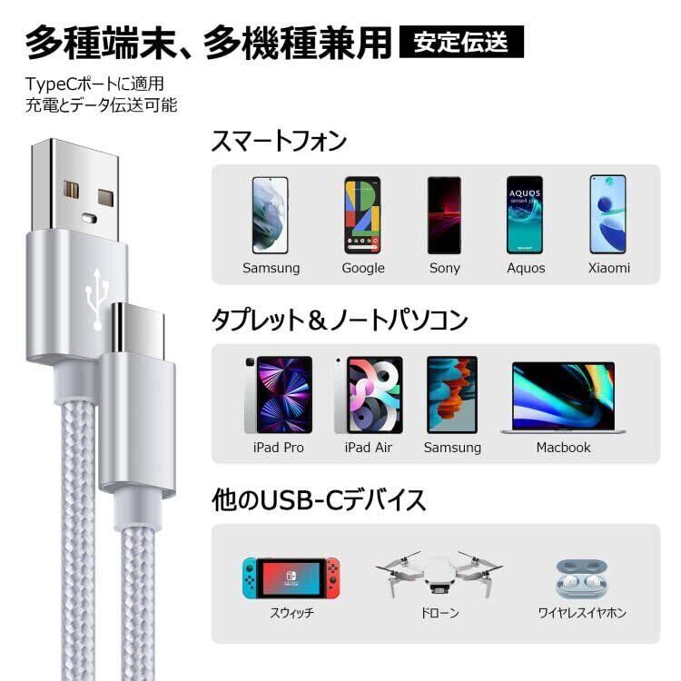 USB Type-C ケーブル 【2本セット&1.83m】 usb c ケーブル スマホ充電ケーブル タイプC ケーブル iPoto 急速充電 Android充電ケーブル QC3.0対応 usbケーブル 充電ケーブル USBコード データ転送 断線防止 高耐久ナイロン iPad Air4,iPadPro,sense,Pixel,Xperia,Xiaomi,Galaxy S22 S21 S10,Huawei,OPPOなどのタイプC多機種対応 シルバー
