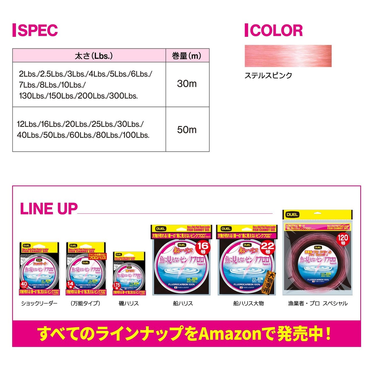 デュエル(DUEL)魚に見えないピンクフロロ ショックリーダー 30m 2Lbs~10Lbs / 50m 12~100Lbs / 30m 130~300Lbs