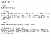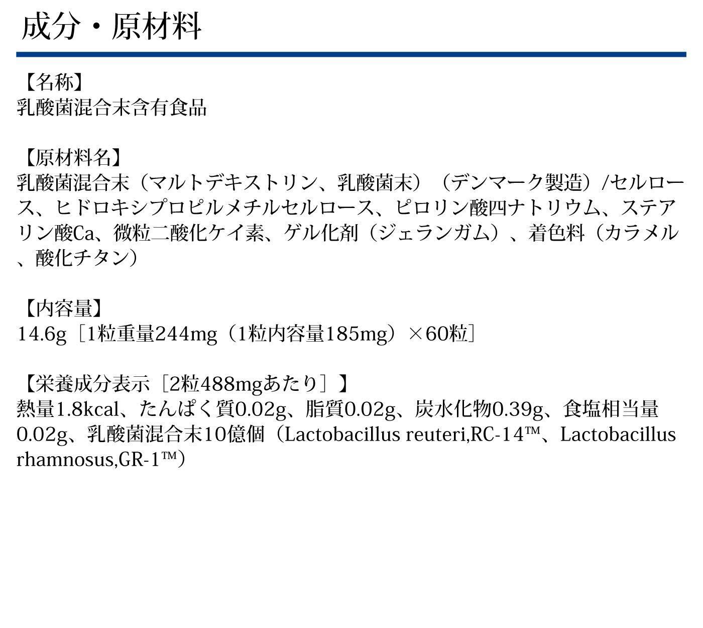【栄養成分表示[2粒488mgあたり]】熱量1.8kcal、たんぱく質0.02g、脂質0.02g、炭水化物0.39g、食塩相当量0.02g、乳酸菌混合末10億個(Lactobacillus reuteri,RC-14TM、Lactobacillus rhamnosus,GR-1TM)