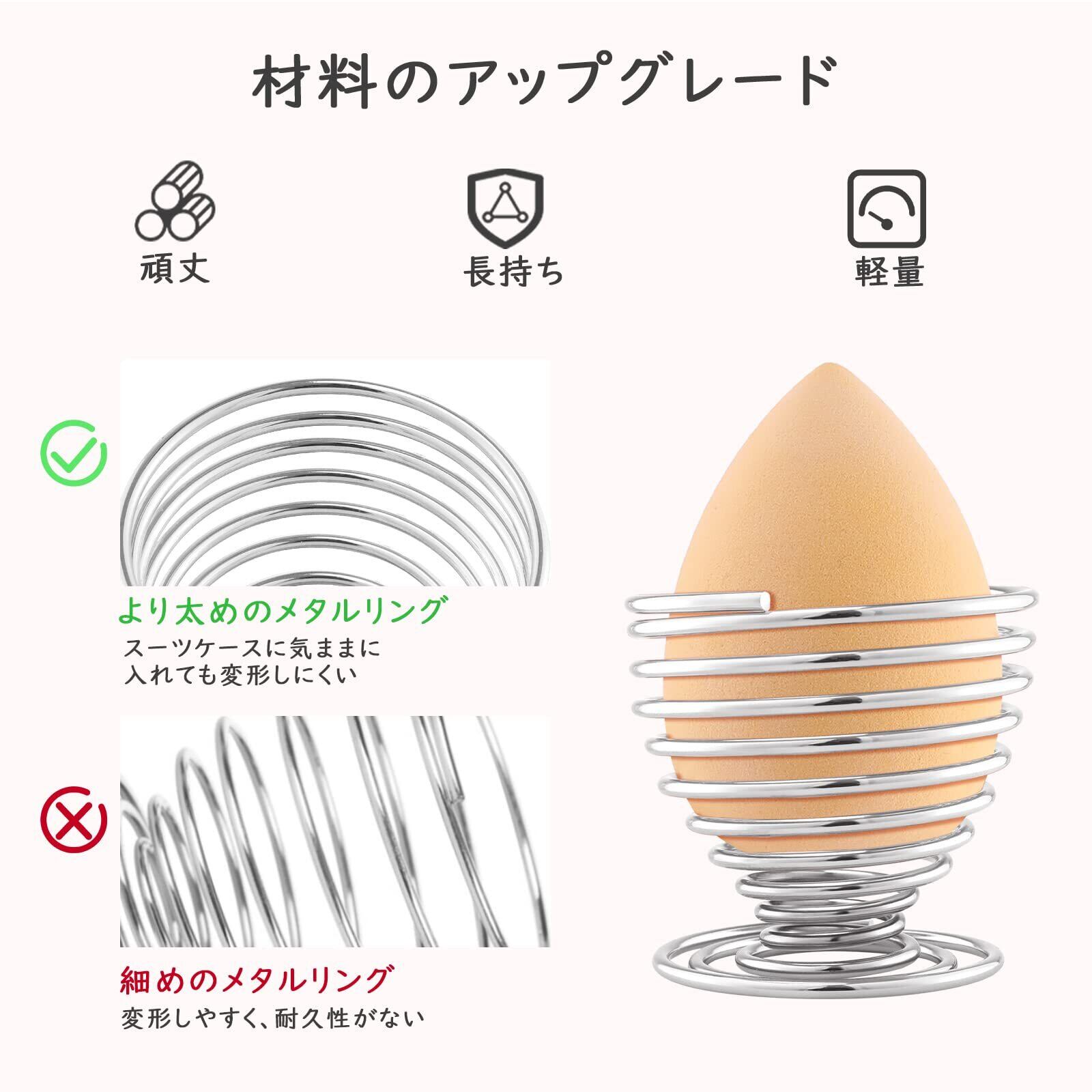 「お洒落ならせん状デザイン」 ワイヤーをらせん状に曲げて、ワイングラスのような流線型のデザインで、優雅でおしゃれな雰囲気満載のアイテム。最大直径5cmあり、各種形状のメイクスポンジに対応できます。化粧台や洗面所に置いて、スポンジ収納と同時に、部屋のインテリアに馴染み、実用性とデザイン性兼備の逸品です。