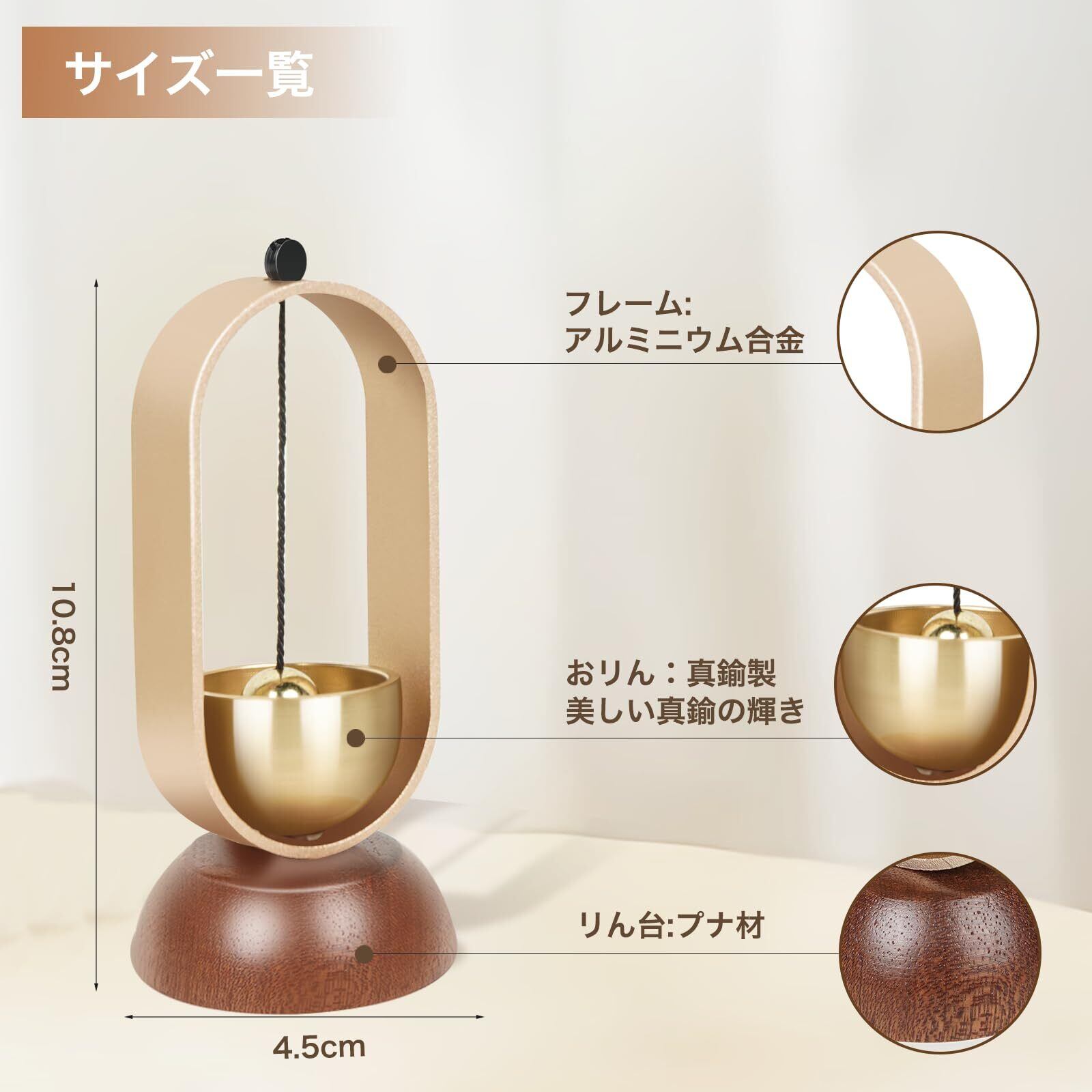 【おりんのサイズ&材質】高さ10.8cm×直径4.5cm おりん(真鍮)*1 りん棒(真鍮)*1 台座(天然木)*1 本体(アルミニウム合金)*1※全て手作業で作られており、天然木を使用しているため、木目等仕上がりが個々で違います。