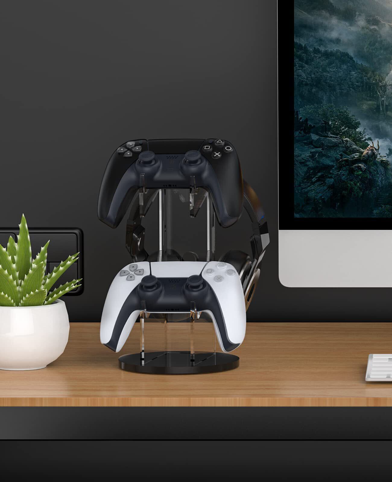 MoKo コントローラースタンド ps5 PS4 コントローラー/ヘッドホン収納ラック アクリル製 ヘッドホンホルダー ゲームコントローラースタンド 卓上置き式 滑り止め 半透明ブラックベース 充電穴付き インテリア PS5/PS4/Switch/Lite/Steam/PC/Xbox One クリア
