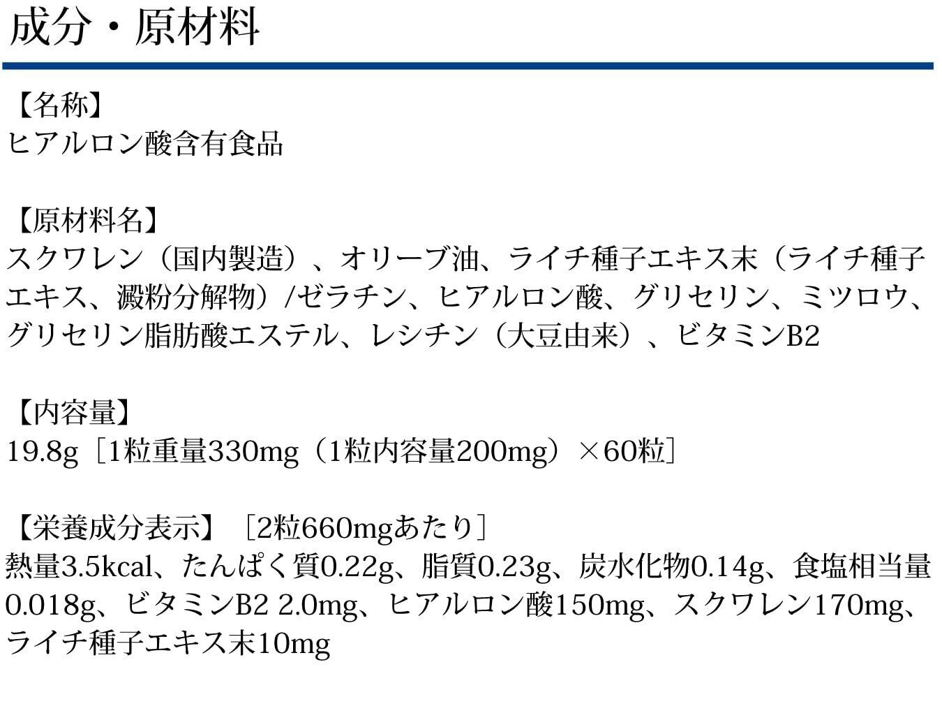 【栄養成分表示】[2粒660mgあたり]熱量3.5kcal、たんぱく質0.22g、脂質0.23g、炭水化物0.14g、食塩相当量0.018g、ビタミンB2 2.0mg、ヒアルロン酸150mg、スクワレン170mg、ライチ種子エキス末10mg