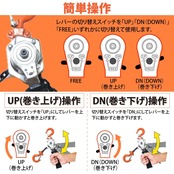 ●早戻しが簡単。作業効率も一段とアップ。 無負荷時に切り替えレバーを中央の位置(N)にするだけで自動空転になり、チェーンの右側、左側の長さ調節ができます。 2本のチェーンを握って、ハンドホイルを回すだけ。 よりスムーズで高効率操作性を実現、プロの現場をパワフル&スピーディーにサポートします。 ● 雨や荷重衝撃などあらゆるショックに強い耐久性の特殊鋼ロードチェーンも装備しております。
