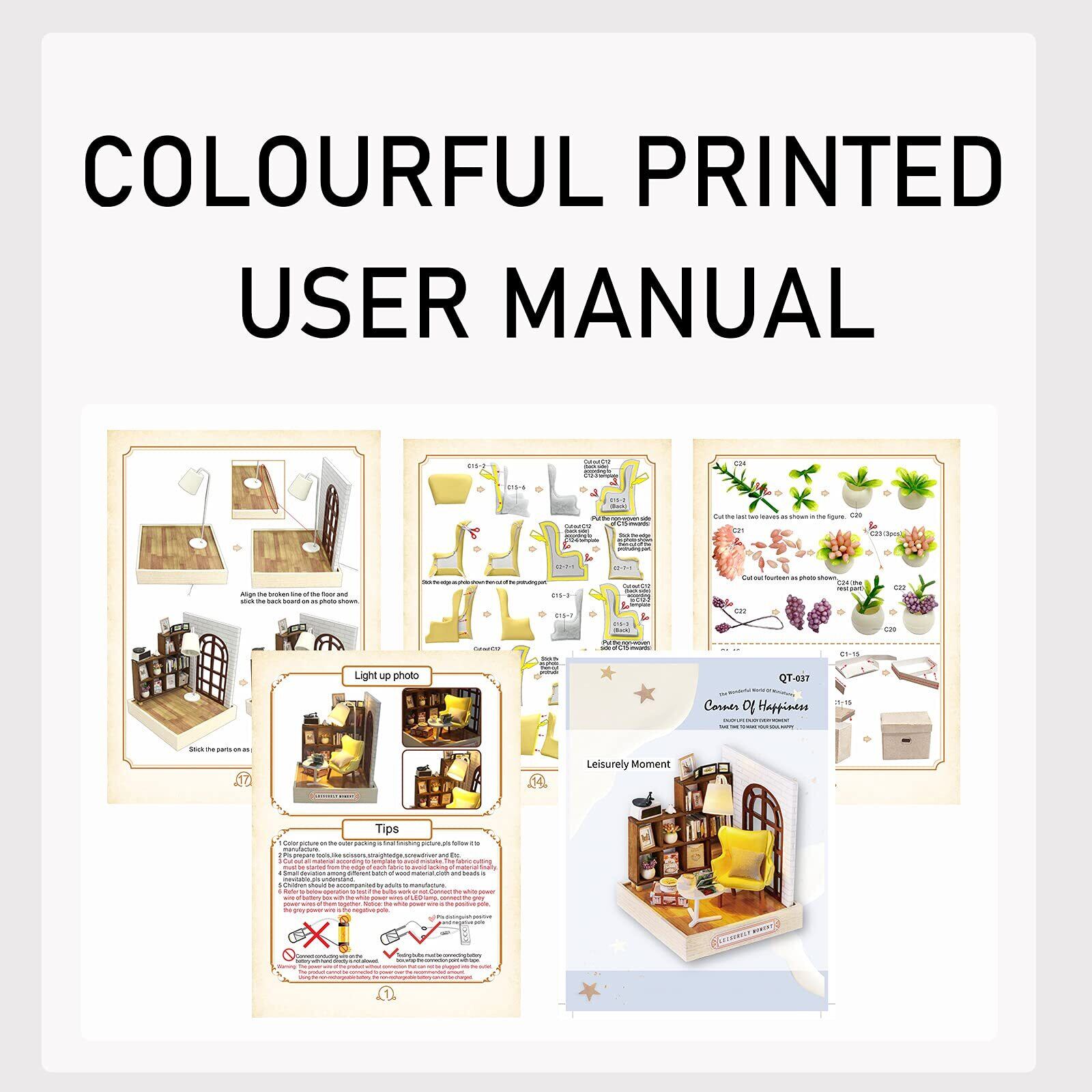 【わかりやすい組み立て説明書付き】詳細なステップごとの英語説明書(写真付き)が含まれており、組み立てのプロセスをガイドします。各ステップが明確に説明されているので、初心者でも上級者でも自信を持って美しいミニチュアドールハウスを作ることができます。