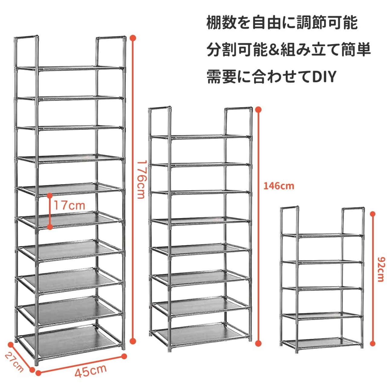 シューズラック 10段 靴収納 18-20足 靴棚 下駄箱 省スペース シューズボックス スリム 玄関に靴を効率収納 靴入れ 組み立て式 幅約45×奥行28×高さ176cm (グレー 10段)