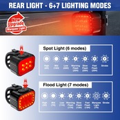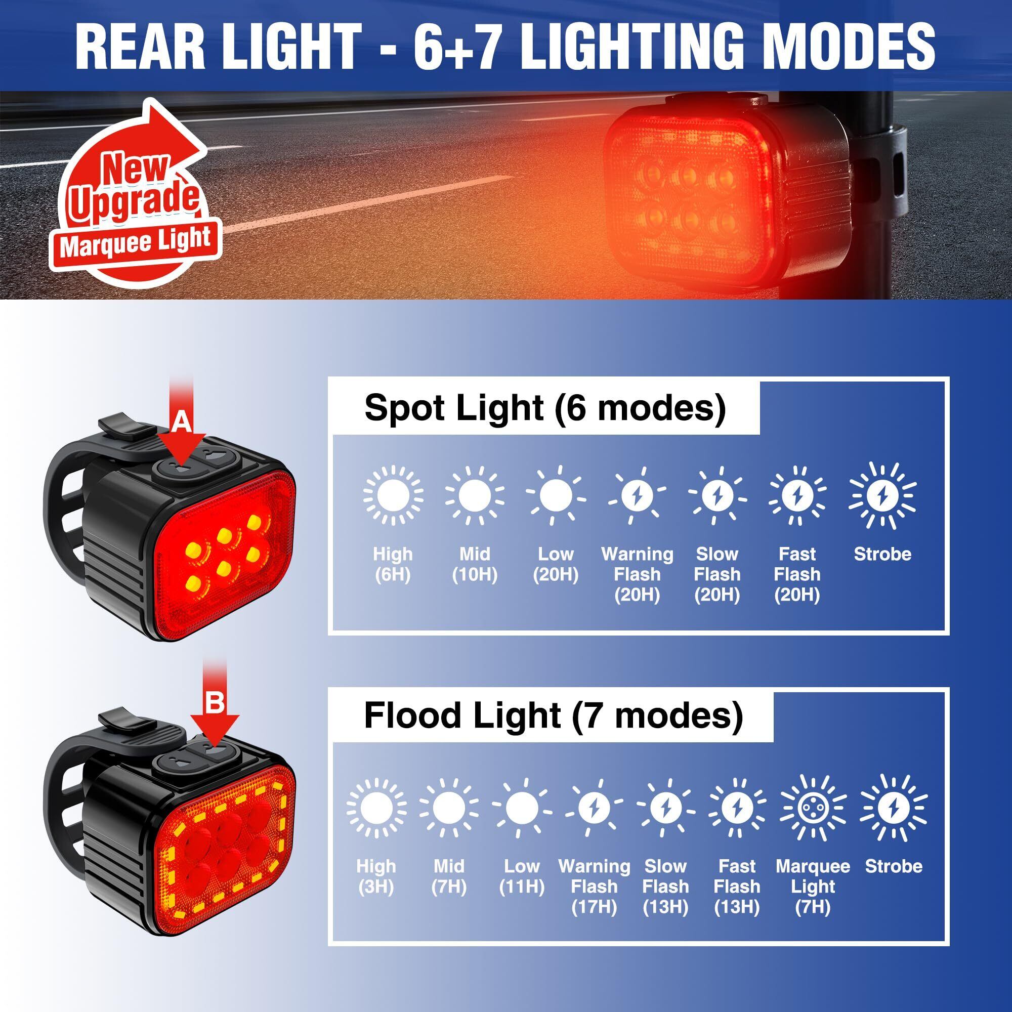 【アップグレード-8+13モード】WORKPRO自転車ライトセットはスポットライト+ワイドライトセパレート設計を採用、フロントライトには4+4モード、テールライトに6+7モードがあり、高、中、低、点滅など多くの点灯モードは様々なシーンに対応できます。スイッチをを2回押すと点滅,2秒長押すといずれのモードでも消灯になる。テールライトにはモード記憶機能を搭載、次回に点灯すると、前回使ったモードに入ります。アップグレードのマーキーライトは、無限サイクルで点灯するため、目に負担をかけずに見やすくなります。
