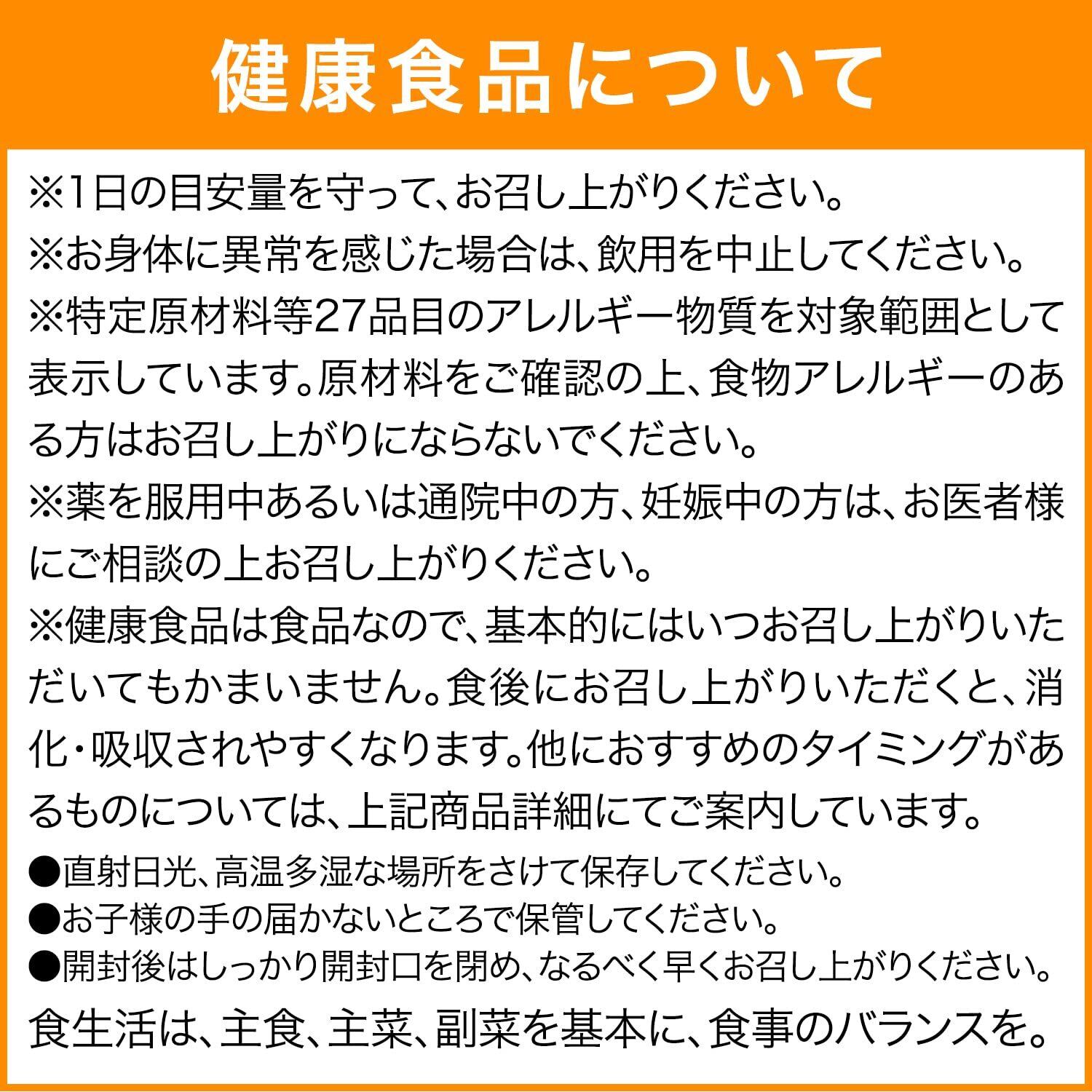 【健康食品について】※一日の目安量を守って、お召し上がりください。※お身体に異常を感じた場合は、摂取を中止してください。※特定原材料及びそれに準ずるアレルギー物質を対象範囲として表示しています。原材料をご確認の上、食物アレルギーのある方はお召し上がりにならないでください。※薬を服用中あるいは通院中の方、妊娠中の方は、お医者様にご相談の上お召し上がりください。●直射日光、高温多湿な場所をさけて保存してください。●お子様の手の届かないところで保管してください。●開封後はしっかり開封口を閉め、なるべく早くお召し上がりください。食生活は、主食、主菜、副菜を基本に、食事のバランスを。