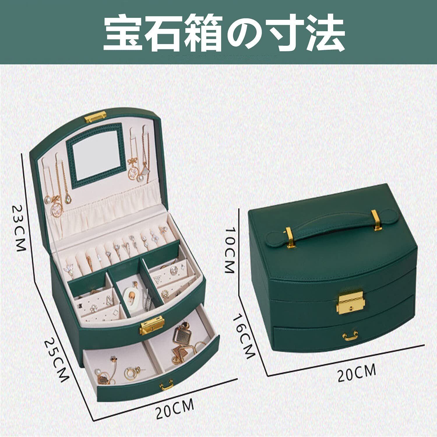 OKUSEKAY ジュエリーボックス ジュエリー収納 アクセサリーケース 女の子 女性 人気 2層 鏡付き 大容量の宝石箱 小物入れ ピアス ネックレス 指輪 イヤリング収納 母の日、クリスマス、結婚式の日、誕生日プレゼント用 (グリーン)