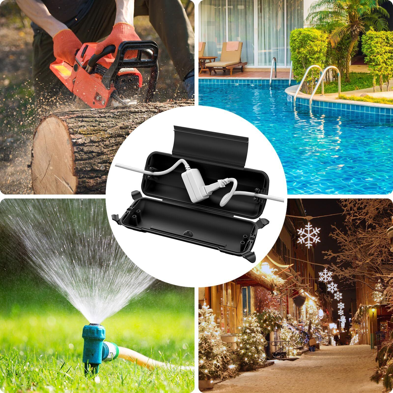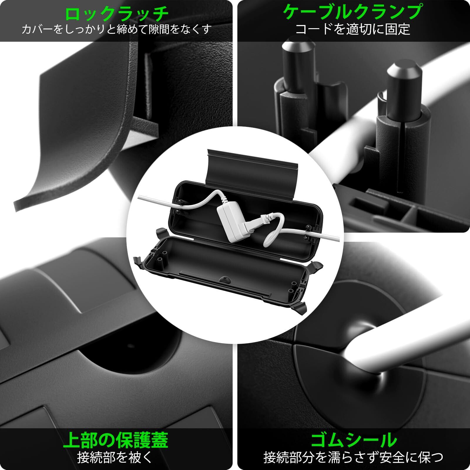 延長コード安全カバー: ロック ラッチx4、ケーブルクランプx2、取り付け穴x2、ケーブルタイx2、防水性と密閉性を確保し、屋外と屋内の電気接続を乾燥させて安全に保ちます。
