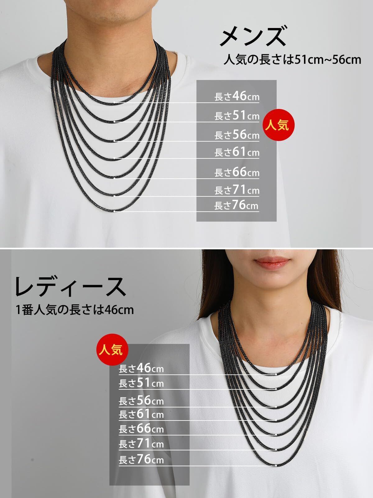【色も!太さも!長さも選べる!】3.5mm、6mm、9mm、12mmの4太さ、シルバー、ゴールド、ブラックの3色、46cm、51cm、56cm、61cm、66cm、71cm、76cm、91cmの8長さ、全72種類を揃えました!