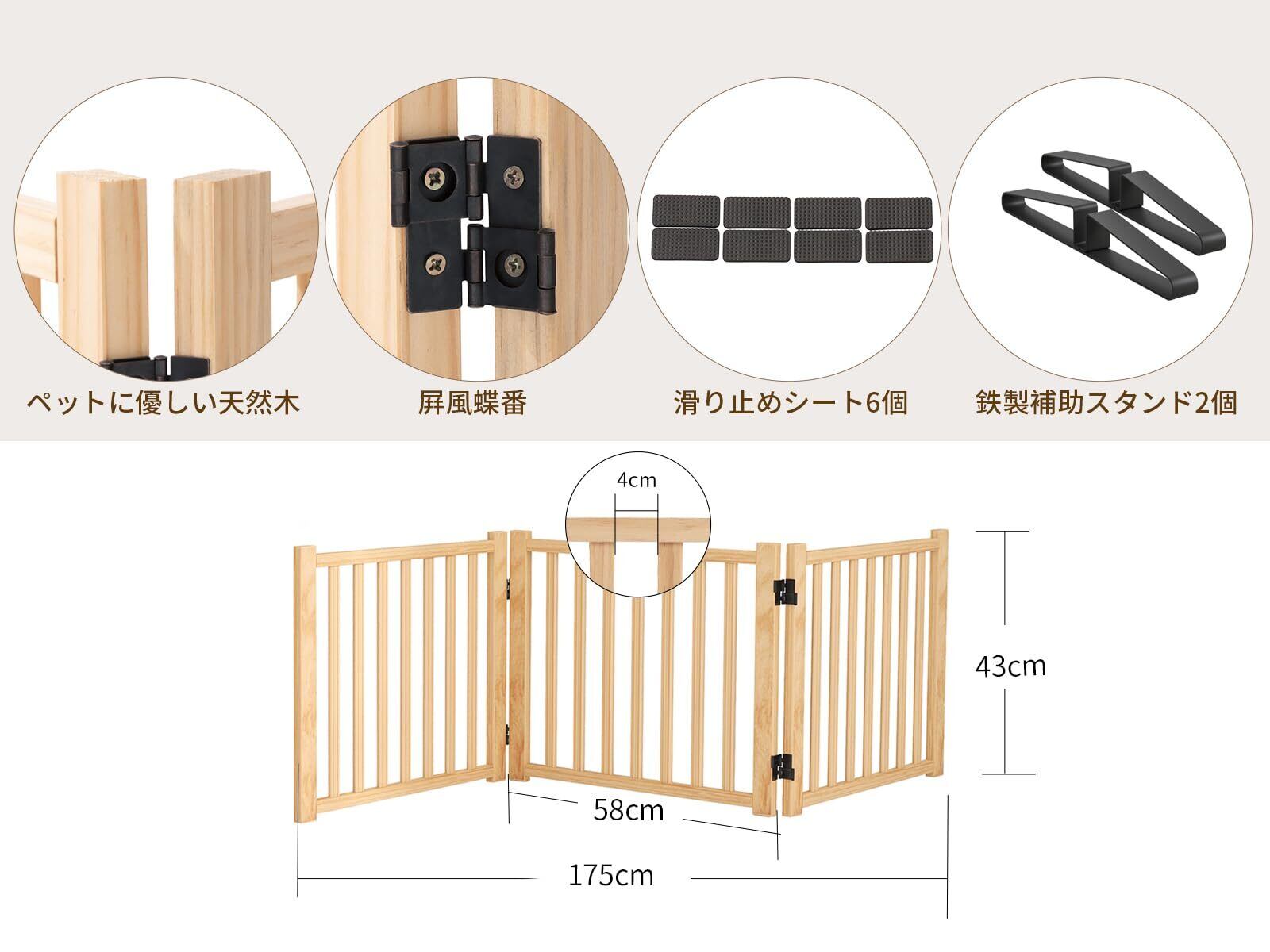 【ペットゲート·商品仕様】材質:純天然の木材。色:原木色。展開時サイズ(約):高さ43cmx幅175cm。収納時サイズ(約):高さ58cmx幅58cm。セット:パネル3枚、滑り止めシート6個、鉄製補助スタンド2個。