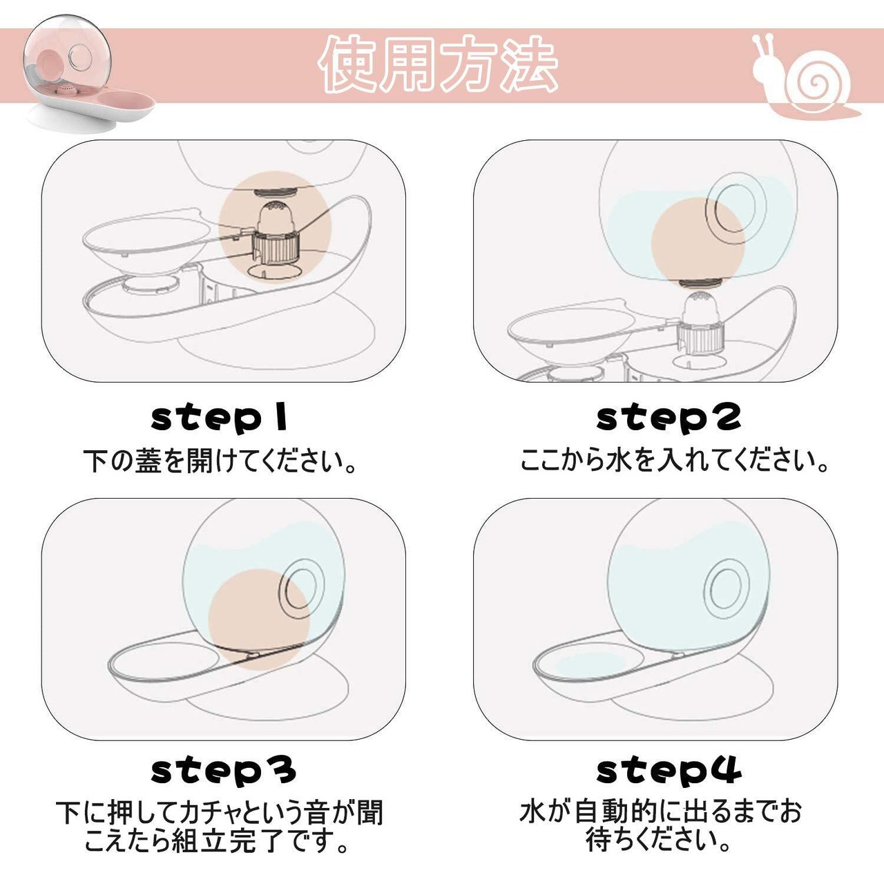 【使用方法】 Step1 給水タンクの底部の両側で手を置き、回せずに給水タンクを直接に上に引き抜けます。或いは、水飲みトレイを片手で押しながら、給水タンクを片手で片側を浮かして引いて外します。(給水タンクを回転しないでください) Step2 給水タンクの蓋を開けて水を入れた後、蓋を締めます。 Step3 給水タンクを台座へ押して「カチャ」と音が聞こえれば組立完了です。