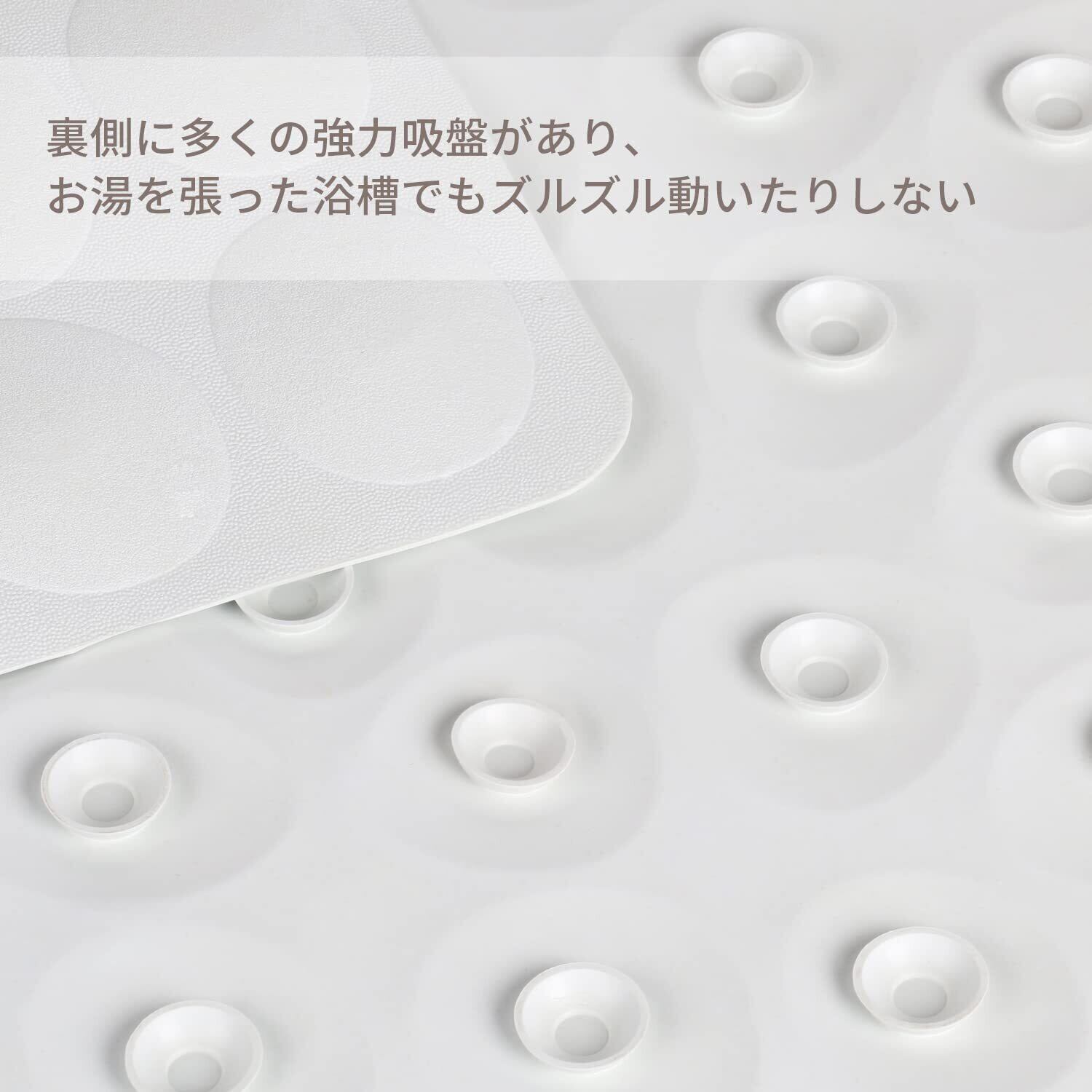 【安全安心】本製品は吸盤で安定性抜群!表面が滑り防止のためのコブルストーンような凸凹のあるデザインで、乗っても滑りにくくなっています。裏面が全面に吸盤で床としっかり吸着固定、ズルズル動いたりしません。耐熱温度が70℃まで、お湯を張った浴槽でも安心して使えます。