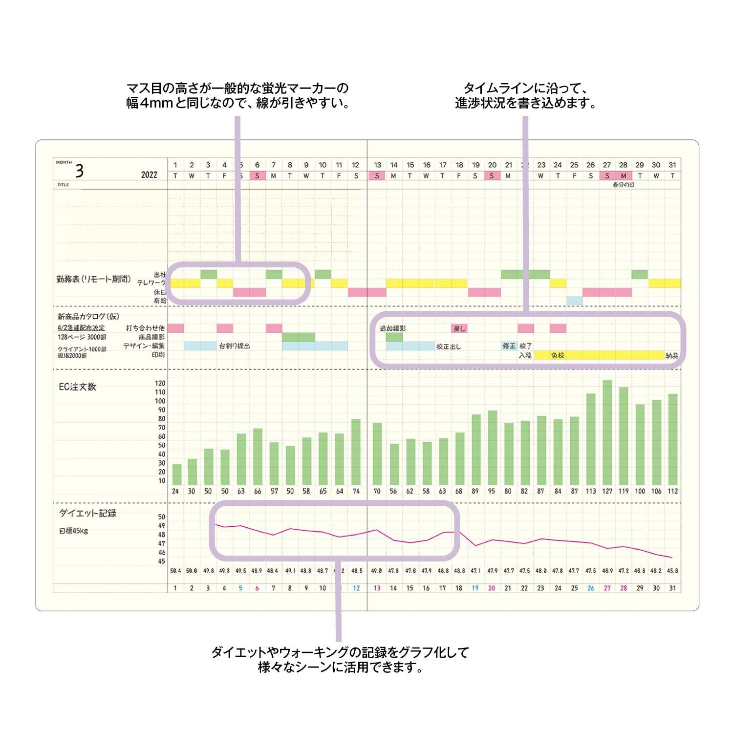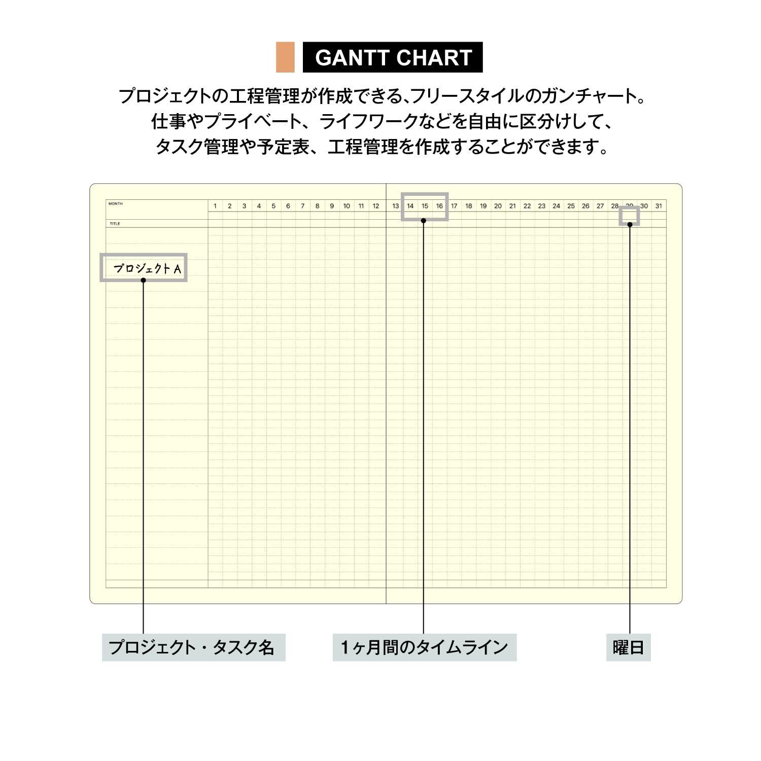 【内容】ガントチャートマンスリー(見開き1ヶ月)24ヵ月分、グリッドメモ12ページ