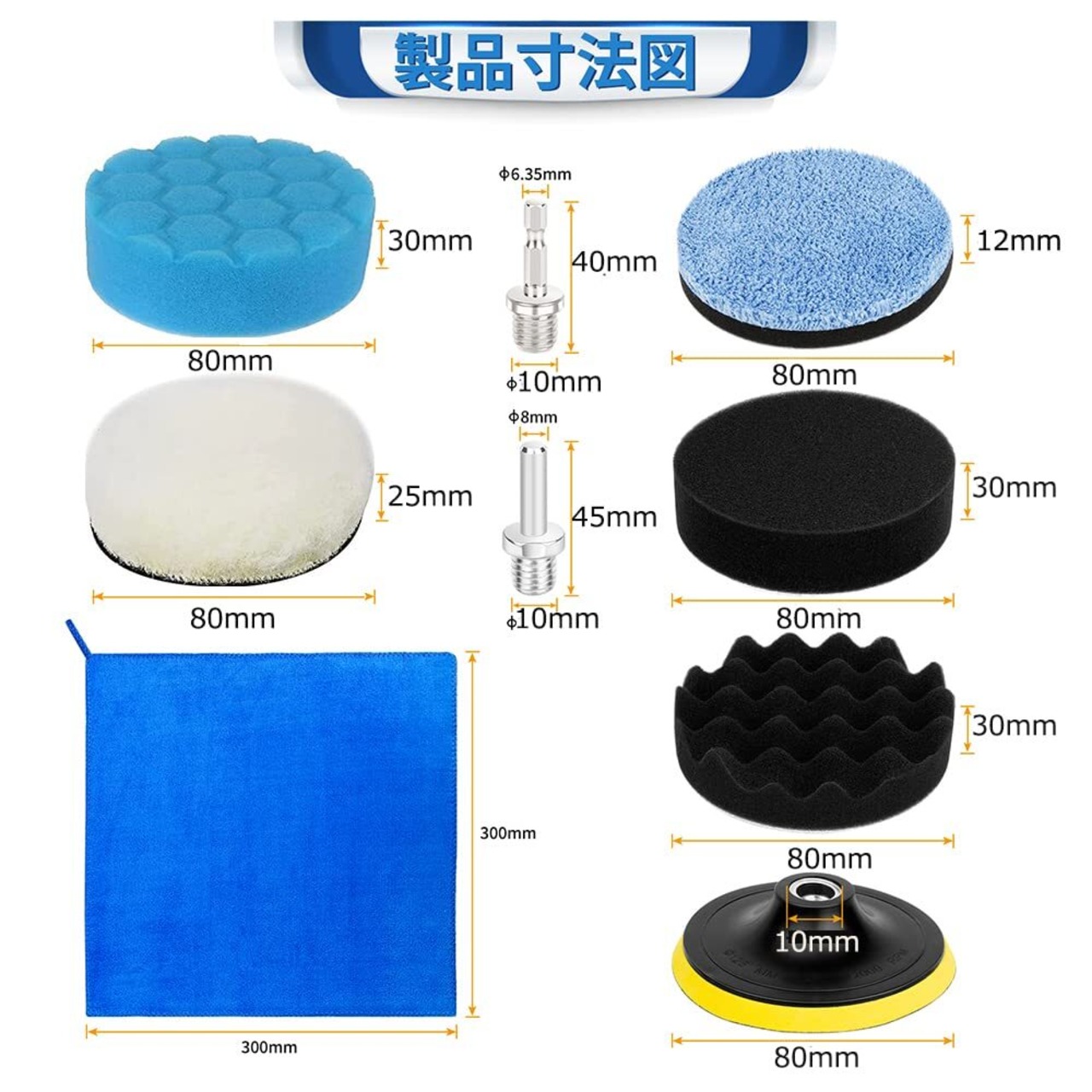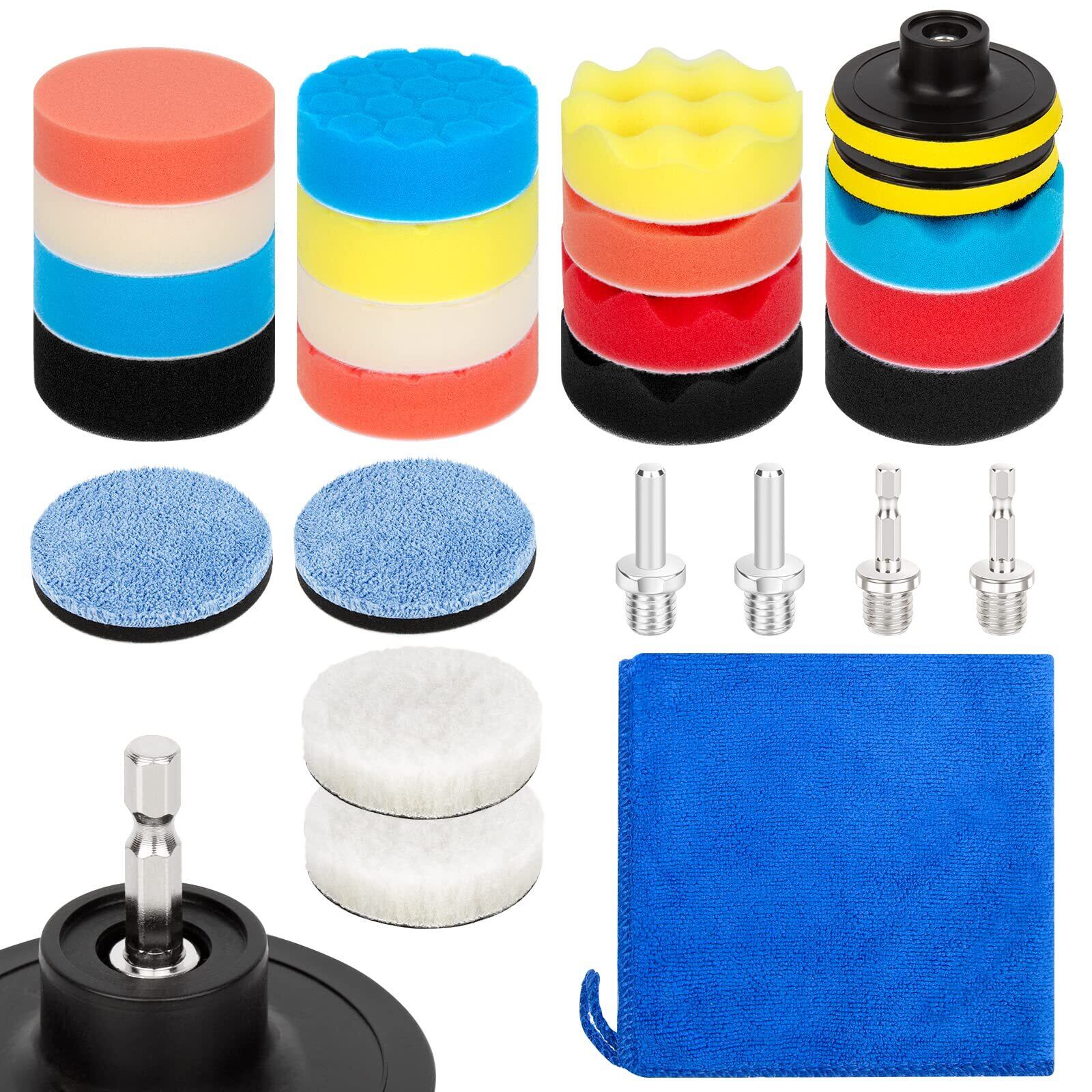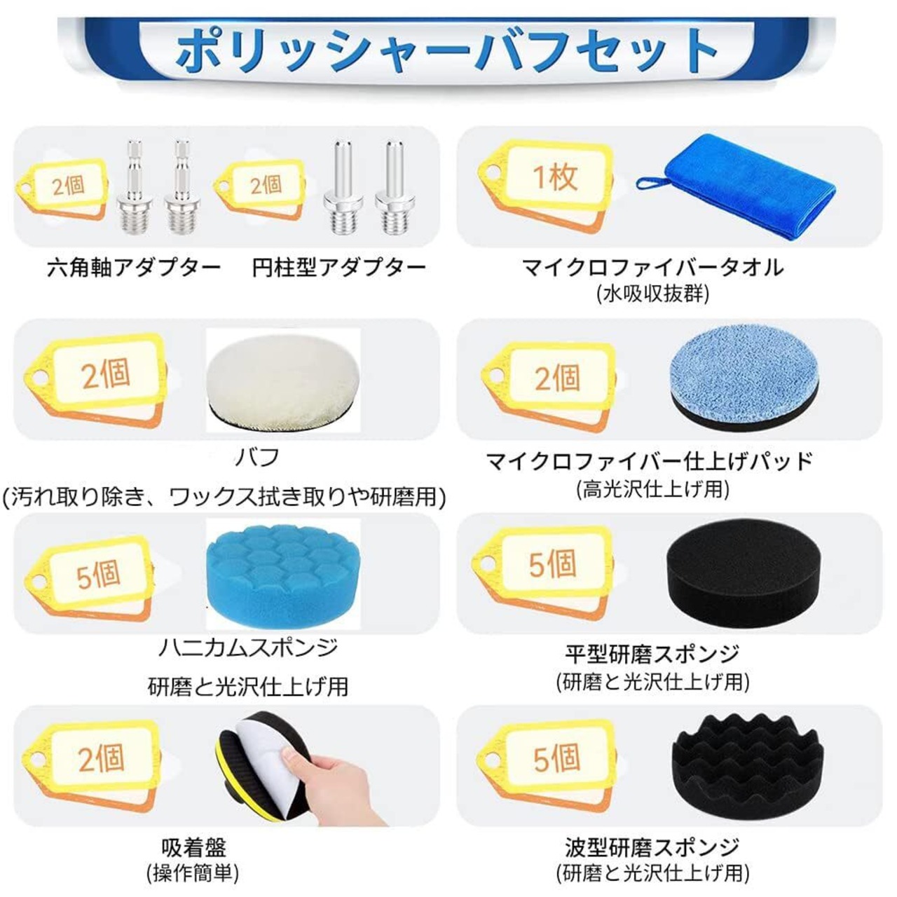 【電動ドリルポリッシャーセット内容】 ①吸着盤*2個 ②研磨スポンジバフ*15個 平面スポンジ、波形スポンジ、ハニカムス型ポンジずつ5個 直径80mm、厚み30mm③研磨パッド*2個 直径80mm、厚み20mm ④マイクロファイバーパッド*2個 直径80mm、厚み10mm⑤マイクロファイバータオル*1個 30*30cm⑥六角軸アダプター*2個⑦円柱型アダプター*2個 合わせて26点セットです。