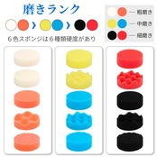 【多機能ポリッシャー バフセット】洗車タオルが洗車の仕上げと、拭き上げ、磨き作業、机の掃除に大活躍です。ポリッシャーバフは五つ種類形状、六つ種類色、六つ種類硬度があります。研磨スポンジの色により、柔らかさが異なっていますが、白色>オレンジ>黄色>青色>黒色>赤色です。スポンジがツヤ出し、傷消しや研磨や光沢仕上げ用です。バフが汚れ取り除き、ワックス拭き取りや研磨に最適です。