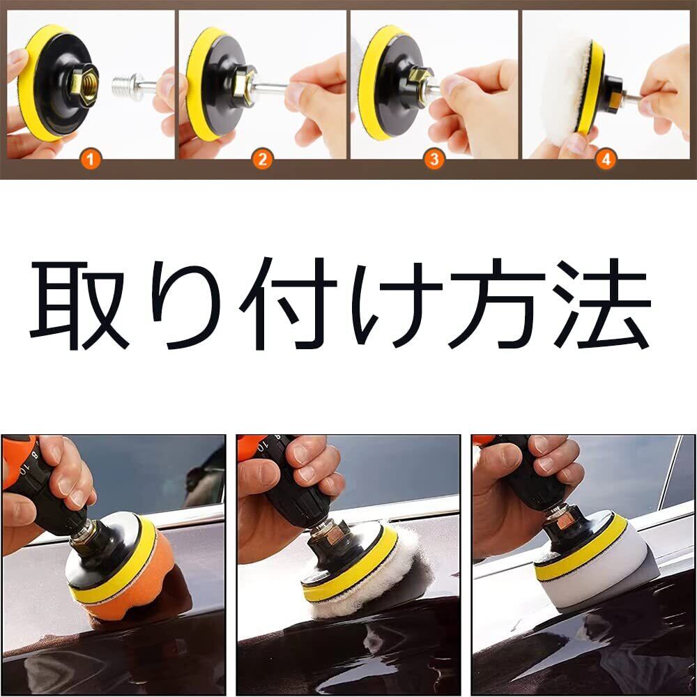 【操作簡単】研磨スポンジとパフの裏面はマジックテープ式なので取付簡単です。マジックテープ部分の白い箇所に貼り付けます。電動ポリッシャーや電動ドリル、グラインダーにより、六角軸ネジ或いは円柱型ネジを選んで取り付けます。高品質パッド、ポリッシャー、スポンジパッドが水で曲がられ、洗え、繰り返し、使えます。使用前にスポンジやバフを清潔します。使用後、ポリッシュが水で洗浄させ、涼しい場所で乾燥します。