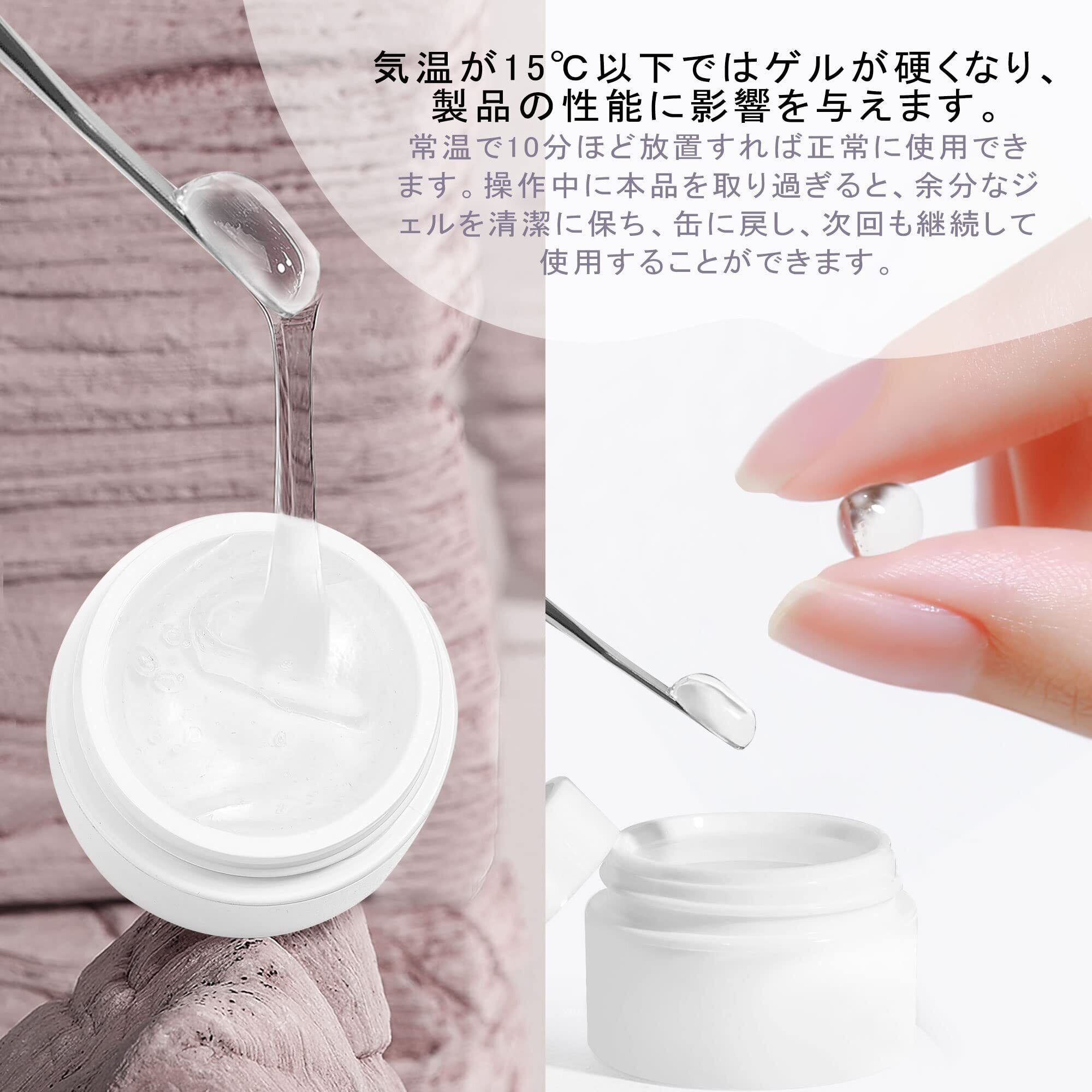 【注意事項】1.厚みをだすと硬化の際に熱を感じることがあります。2.固形タイプなので、本製品を取り出すには木の棒やステンレススティックを使用する必要があります。3.気温が15℃以下ではゲルが硬くなり、製品の性能に影響を与えます。常温で10分ほど放置すれば正常に使用できます。4.製品に若干の気泡があるのは正常な状態ですので、安心してお使いください!