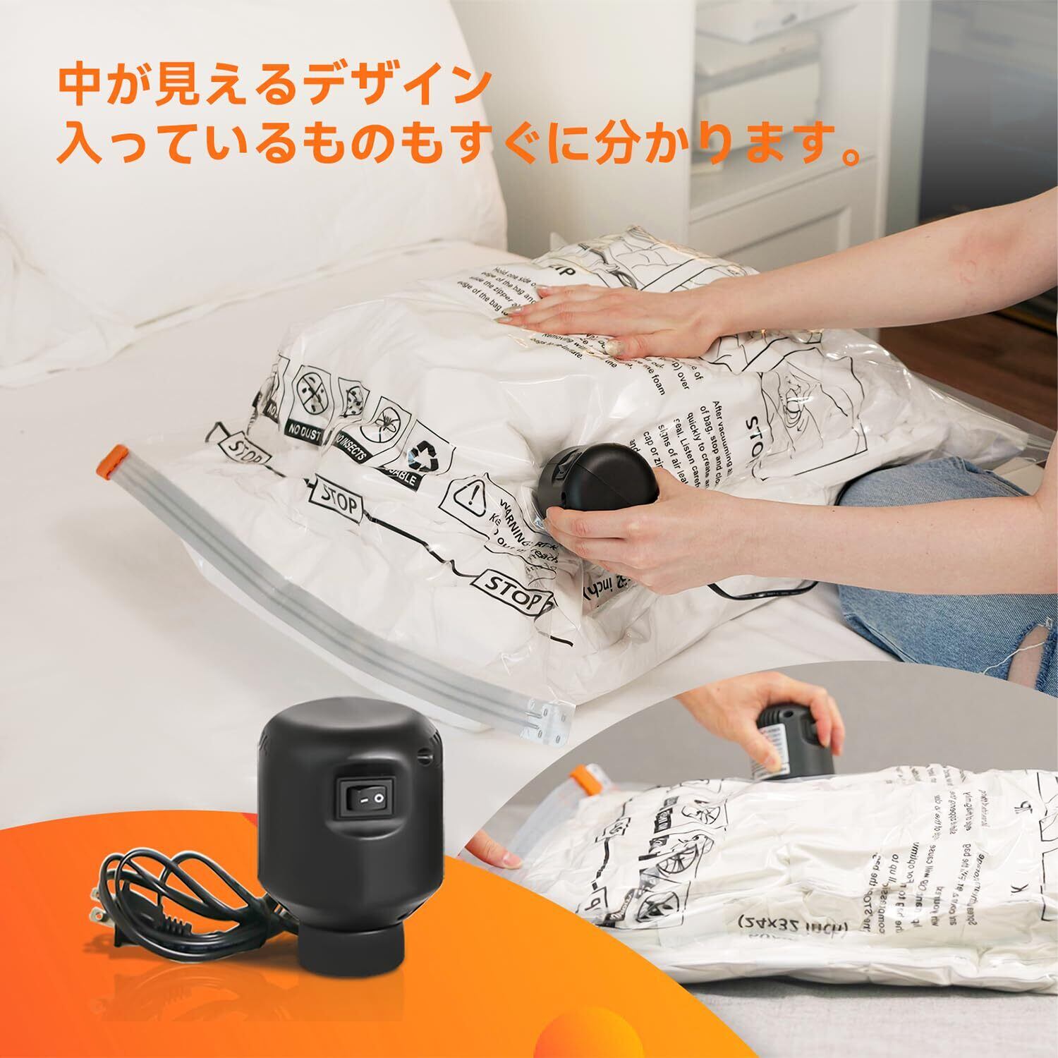 【電動ポンプ付き】布団圧縮袋 電動ポンプで効率よく圧縮収納できます。ハンドポンプより手の痛みがありません、もっと手間が省けます。【セット内容】 狭い収納スペースを有効活用できる衣類圧縮袋です。8×L収納袋 (約70X100cm) 、1×電動ポンプ付き。