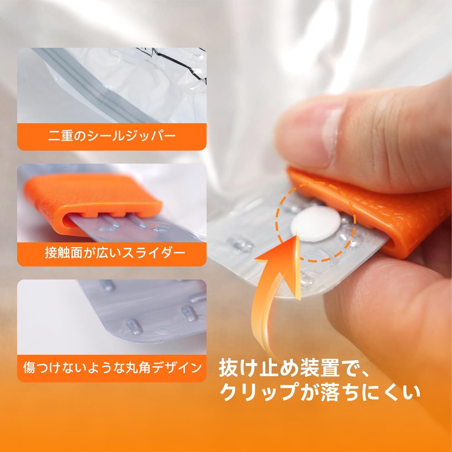 【接触面が広くて省力】布団収納袋のクリップの接触面が広くて省力になり、クリップを繰り返しスライドでしっかり密封できます。※:バルブにあるピンクのシリコン弁を抜かないでください。ジッパーの端に抜け止め装置があり、クリップが落ちにくいです。