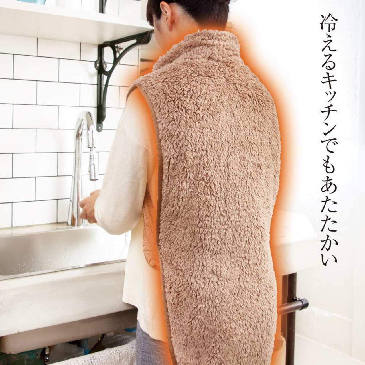 家事など作業がしやすいように前身頃のない形状で、寒さを防ぎつつ冷えやすい背面を温めます。袖なしなので作業がしやすく、デスクワークやキッチンでも大活躍。