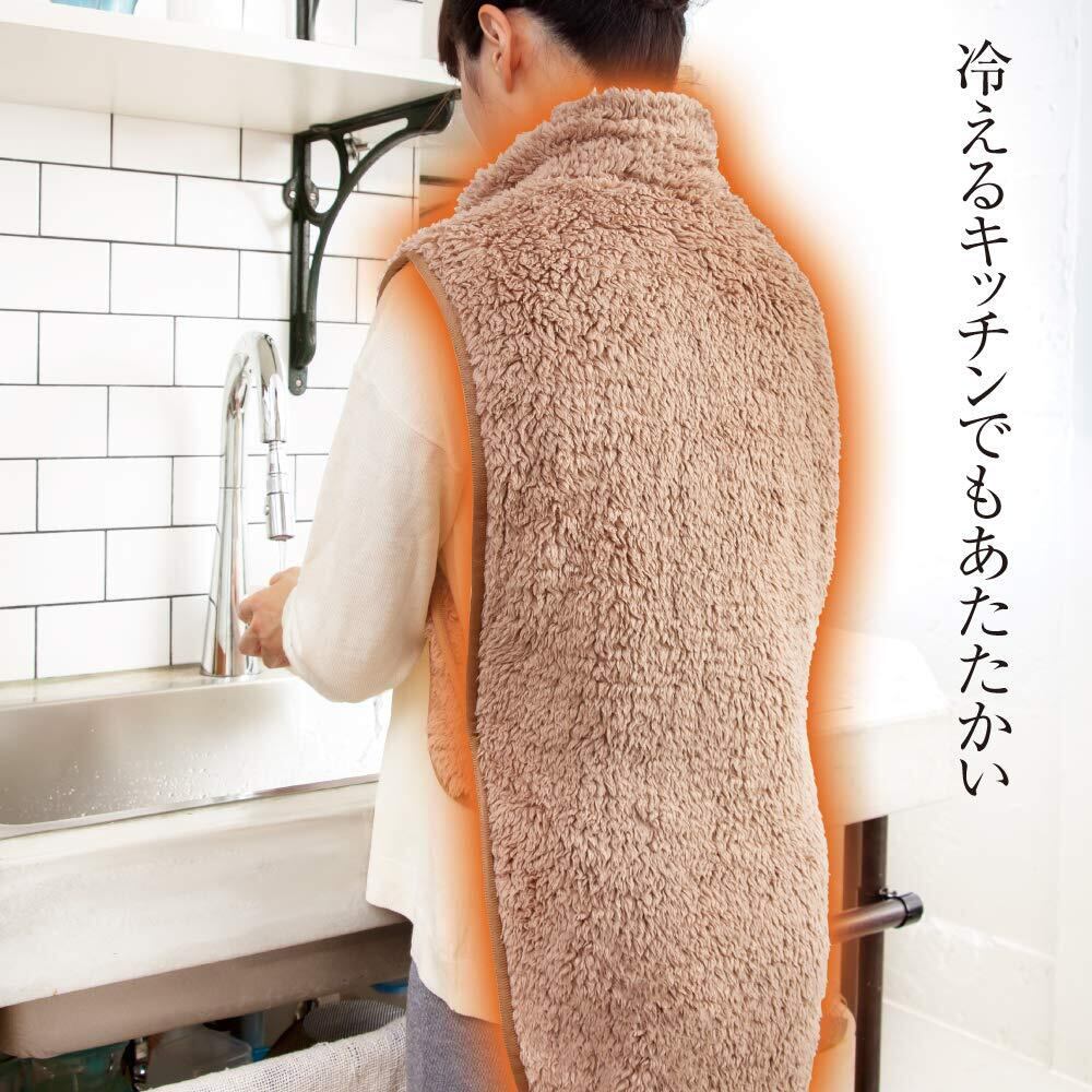 家事など作業がしやすいように前身頃のない形状で、寒さを防ぎつつ冷えやすい背面を温めます。