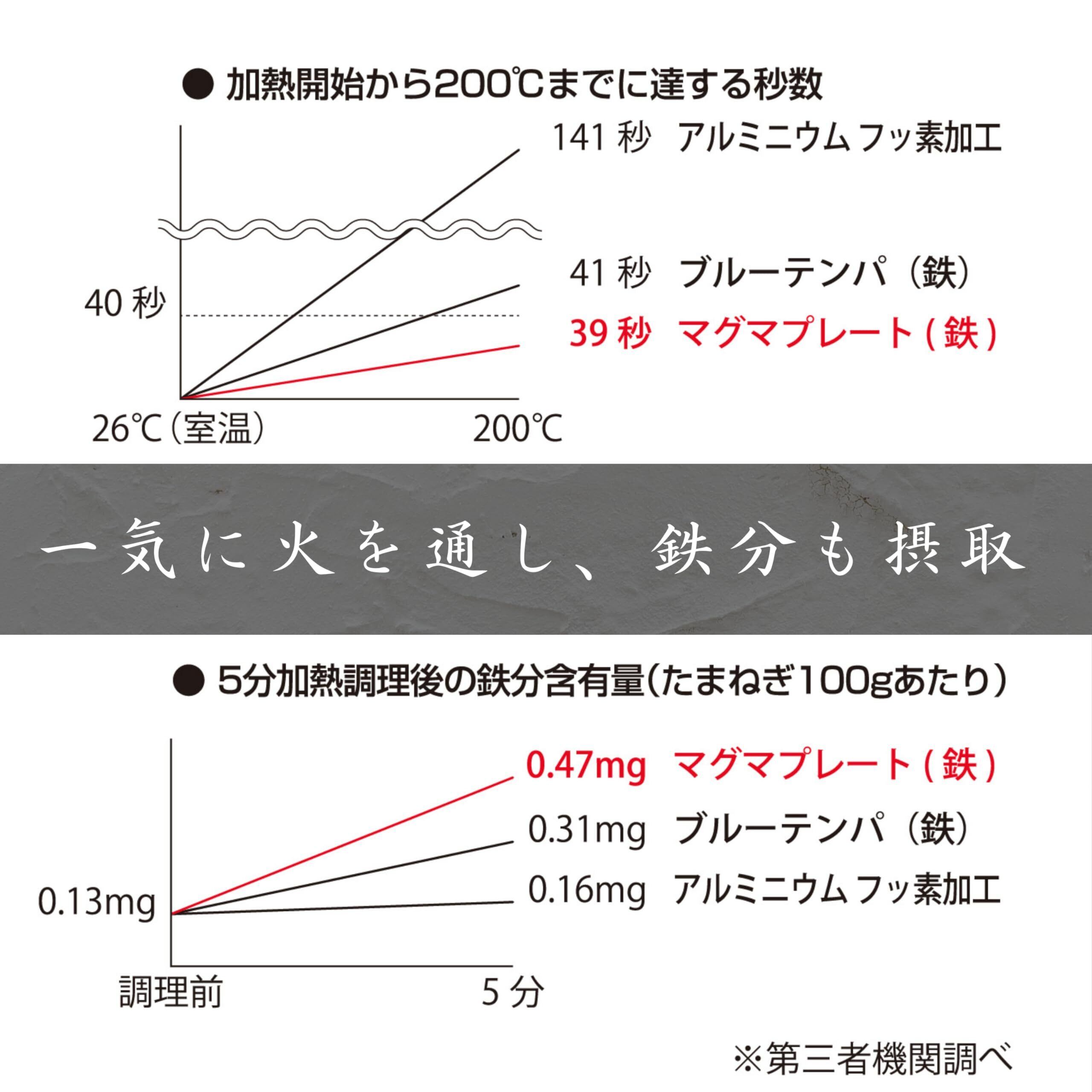 内側と外側の両面に細かな凹凸を付けた独自開発プレート。凹凸により表面積が広くなるので、熱伝導が良くなり食材の芯まで一気に火を通し、食材の旨味を閉じ込めることができます。さらに、フライパンからの鉄分溶出により食材と一緒に鉄分摂取ができます。また、凹凸を付けた表面加工により、油馴染みがよく、使っていくほどに焦げ付きにくくなります。