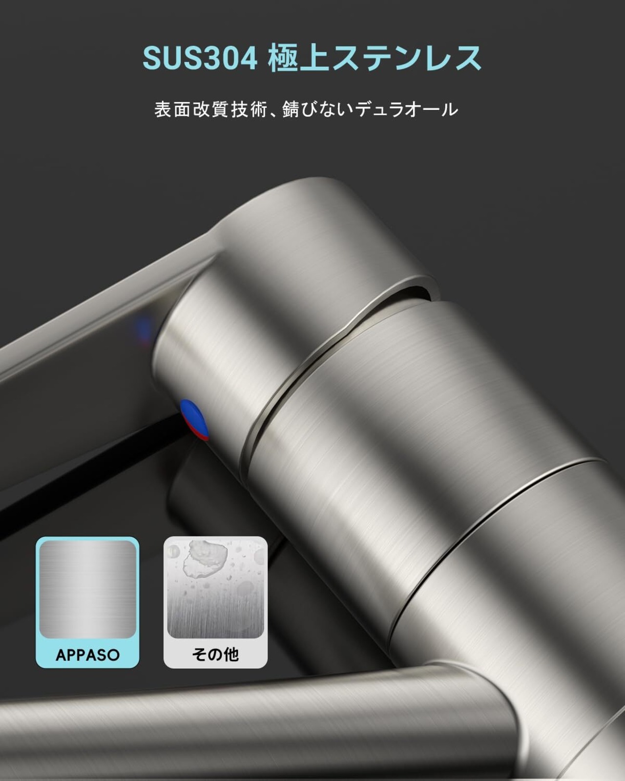 高品質の304ステンレススチール蛇口蛇口本体+ 304ステンレススチール継手、劣る201ステンレススチール素材ではありません。キッチン蛇口は本物の材料で作られ、頑丈で耐久性があります。 表面は7層ナノコーティングとPVDコーティング技術により、油や水垢から蛇口を守ります。