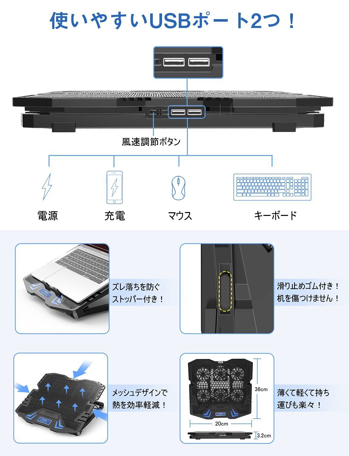 【活用できるUSBポート・軽量で汎用性が高く】給電用USBケーブルで接続だけでスッキリ!電源のない場所でも使用可能!本体側面にUSBポートが2つ付き、複数の電子機械を使用できます。ファンに動作確認用青色LEDが搭載、電源ON時に点灯し動作中であることが一目で分かる。 冷却台の重さ:約822g。他社と比べもっと軽量コンパクトで、使用しないとき、折り畳んで収納と持ち運びが簡単です。【品質保証】お買い上げ日から一年間のメーカー保証致します。 30日以内に商品をご満足いただけなかった場合、無料交換/全額返金対応!お気軽にお問い合わせください。[給電用USBケーブル付き]