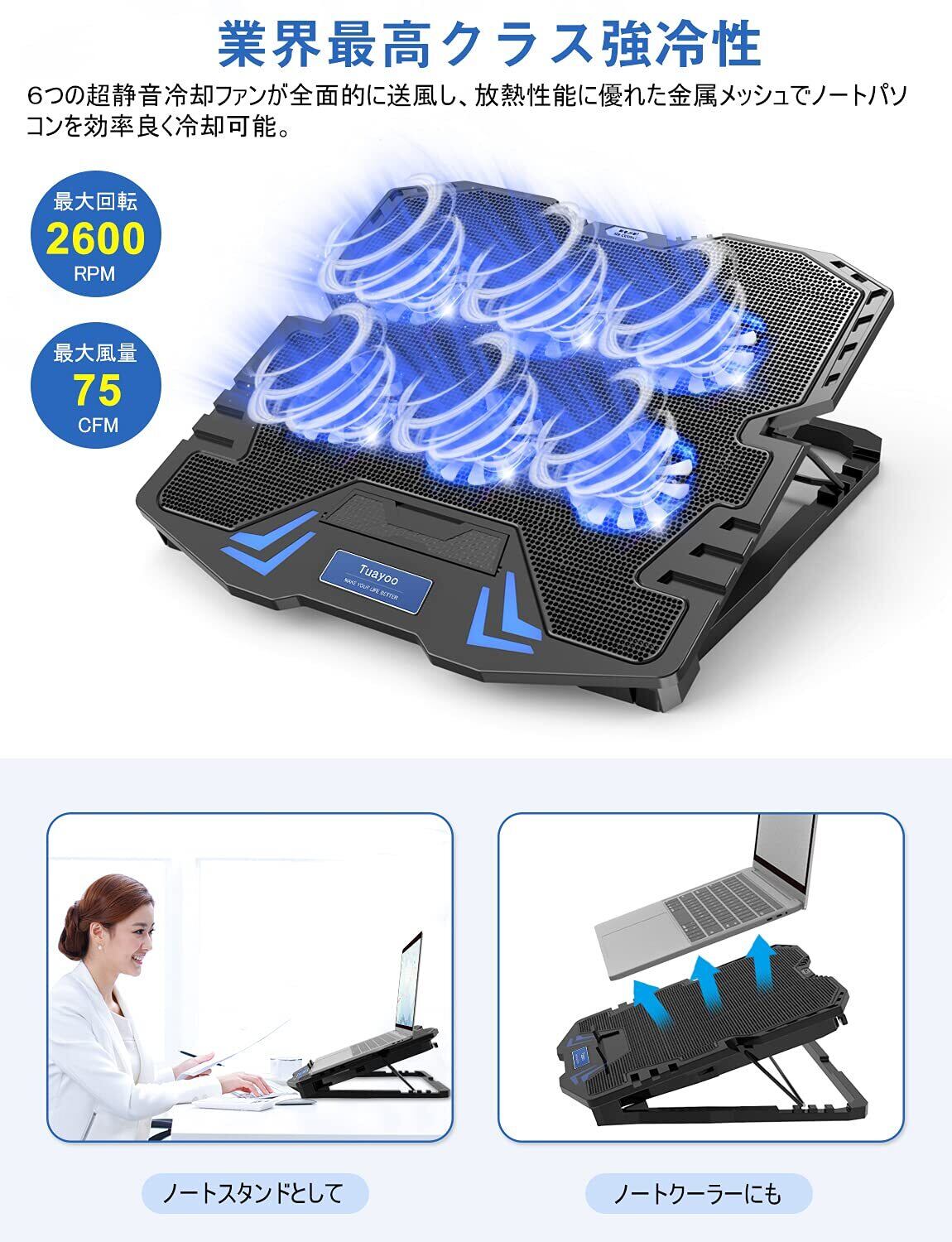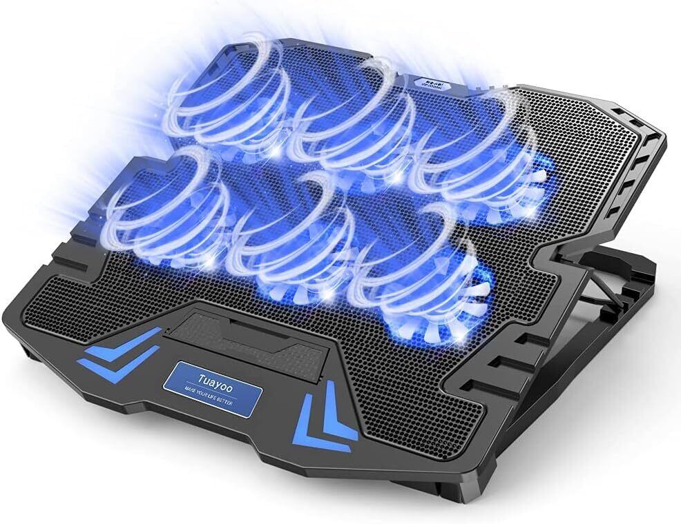 『Tuayoo新登場・強冷 冷却ファン』ノートパソコン冷却パッド 冷却台 6つ冷却ファン搭載 5段階高度調整可 風量調節可 ノートPCクーラー 大風量・低騒音 2つUSBポート付 メタルメッシュデザイン 滑り止め付き ledストリップライト付 9-17インチまでのノートPC/Macbook/Macbook Pro/PS3/PS4等に対応 オフィス/在宅勤務/出張などに適用 日本語取扱書付 ブラック
