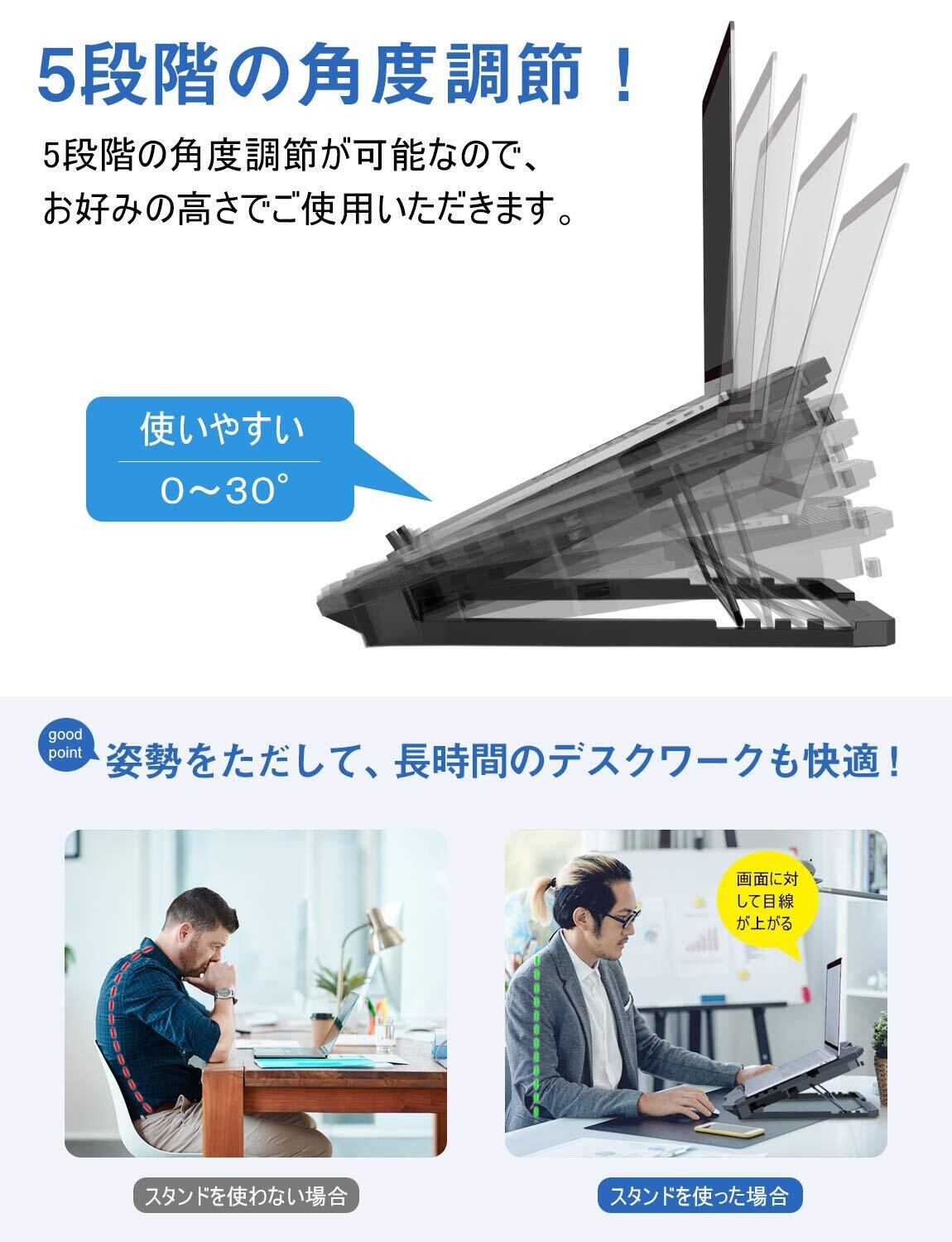 【5段階角度調整・9~17インチ対応】人間工学に基づいた設計により、5段階角度調整可能、パソコン用スタンドとしても使えます。ノートパソコンの角度を0°~30°まで、お好きな角度を調節ができ、首の負担を和らげる、長時間作業しても首や頭が疲れがありません。サイズは36×30×3.2cmあり、9〜17インチまで様々なノートパソコンに対応可能。8kg(耐荷重)程度まで頑丈な土台で2kg以上のノートパソコンを設置しても余裕です。スリップ防止ゴム付き、ノートパソコンの滑り落ち、揺れや傾きを効果的に防ぎ、どんな角度でもしっかりとした抜群安定性を実現。画面高さを調整できるので、背筋を伸ばした正しい姿勢で作業できる、肩周りの凝りを減らせ、首と背中の痛みや目の疲れを防げます。外出自粛期間にデスクワークがもっと快適になります! .