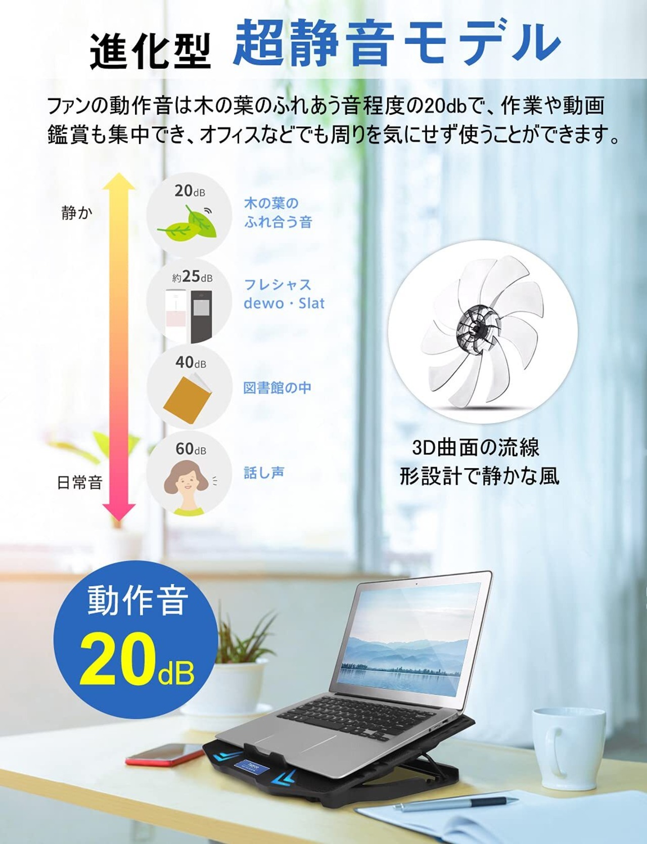 【20db低騒音・風量調節機能】3D曲面の流線形設計、羽根のエッジを丸くすることで風を送る騷音を減らし、気になっていた動作音を解消します。ファンの動作音は最大にしても20db以下なので、周囲への影響が最小限になり、在宅勤務、オフィスや深夜の家庭での常用に最適です。無段階風量調節機能も付く、パソコンサイズや気温、そして作業内容に合わせて調節できるので、省エネにもなります。最大風量が75.0CFMであり、zoomで長時間web会議しても超静音強冷をお楽しみください! .