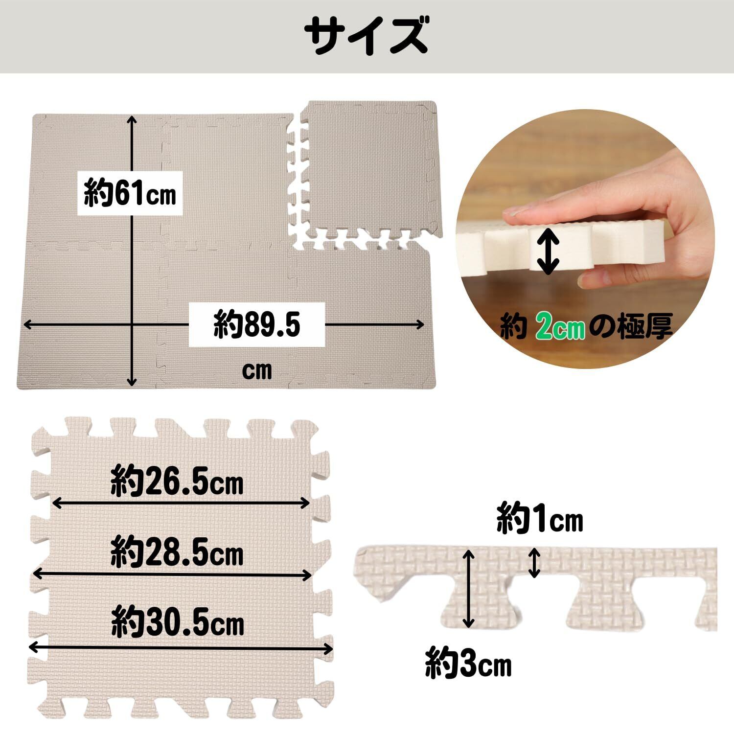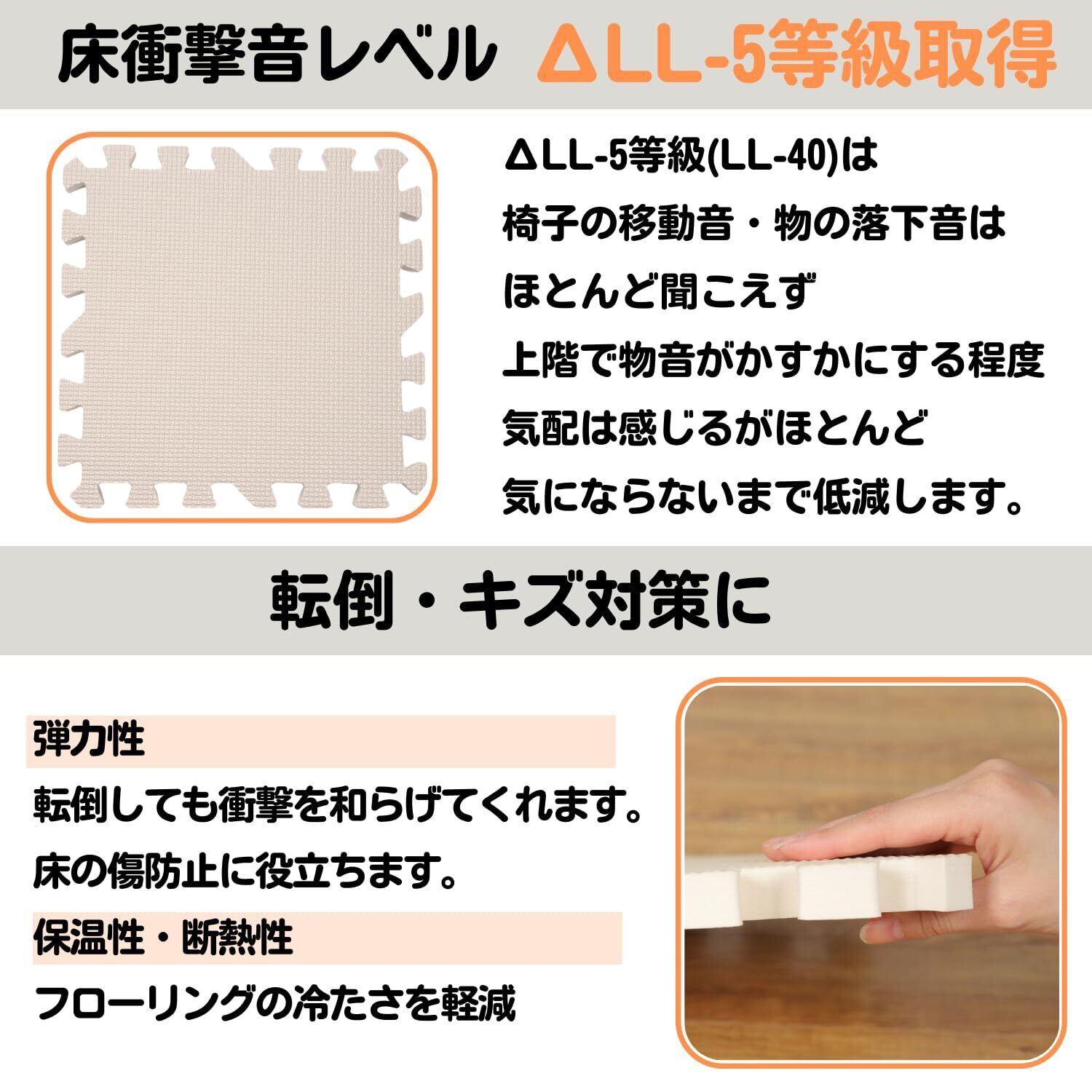 【高いクッション性】[防音性]厚さ約2㎝の極厚で騒音を吸収し音漏れを防ぎます。[弾力性]転倒しても衝撃を和らげてくれます。また床の傷防止に役立ちます。[保温性・断熱性]フローリングの冷たさを軽減してくれます。