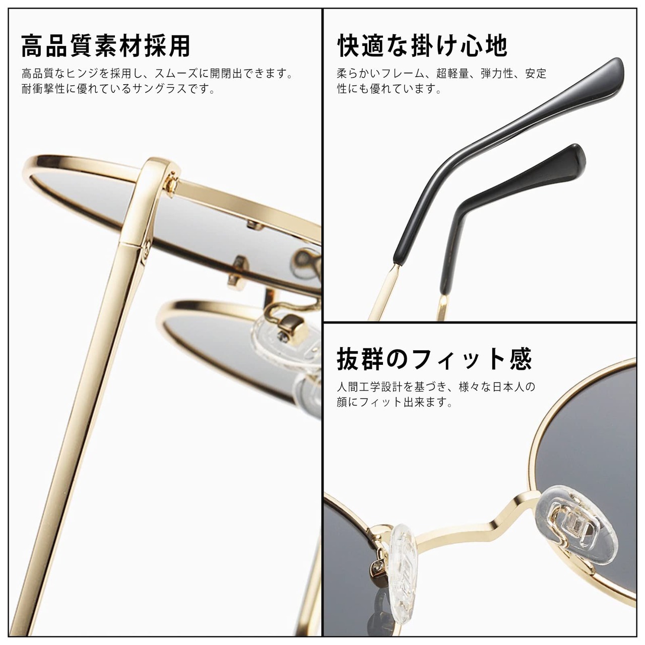 抜群の掛け心地 : 人間工学に基づいて仕上げており、日本人に骨格により最適なフィット出来るを追求しています。軽量で肌に優しい素材の金属フレームは、長時間掛けても痛くならず、違和感がなく、痛くならず、より最高なかけ心地を提供します
