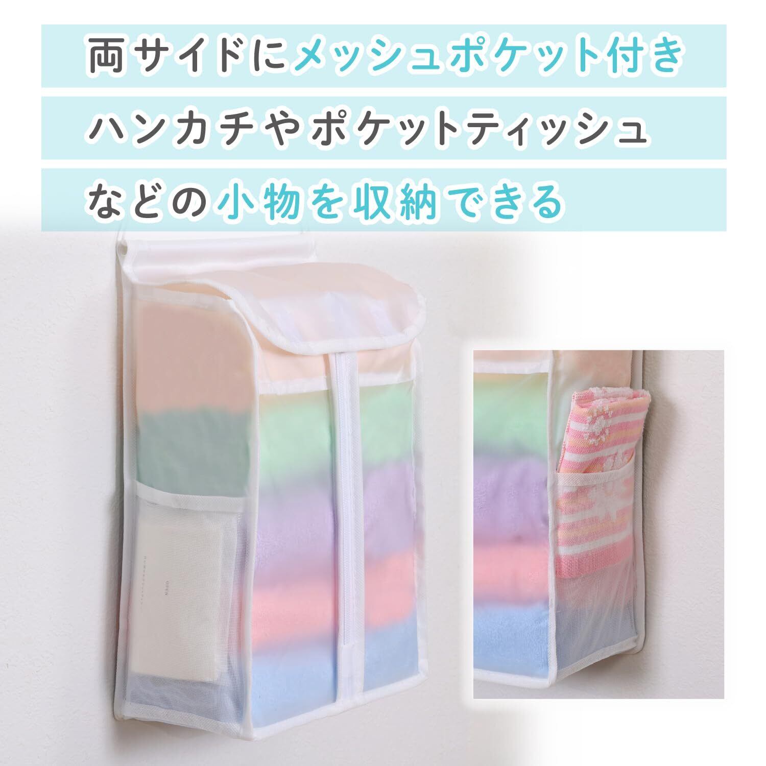 アストロ タオル収納ケース ホワイト 半透明 タオルストッカー 壁掛け 吊り下げ フェイスタオル入れ 保管ケース タオルホルダー 水に強い お手入れしやすい ポケット付き 110-03