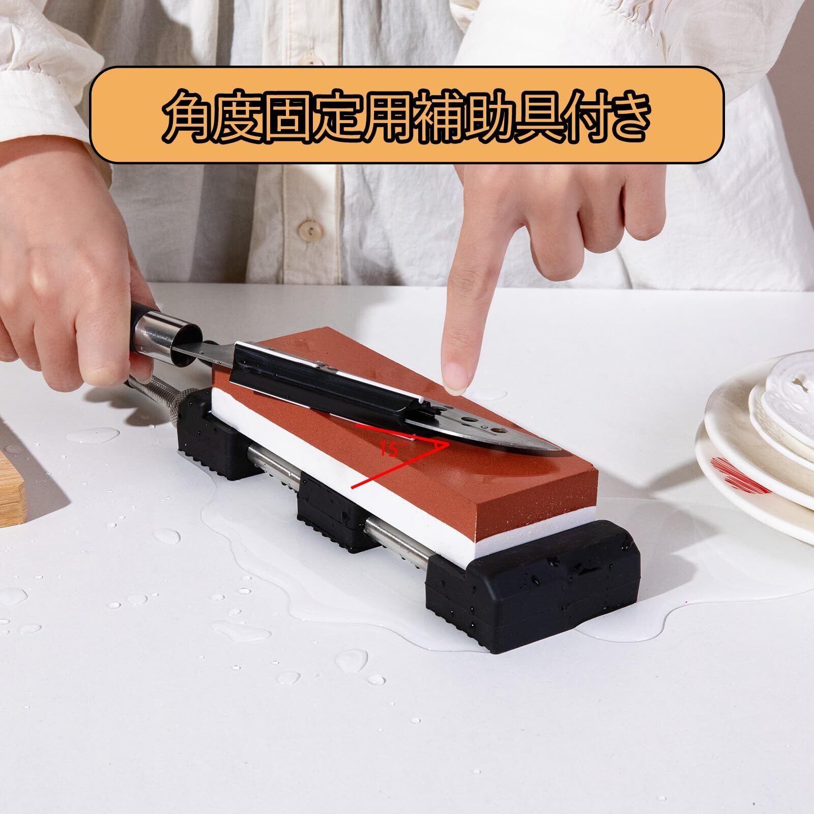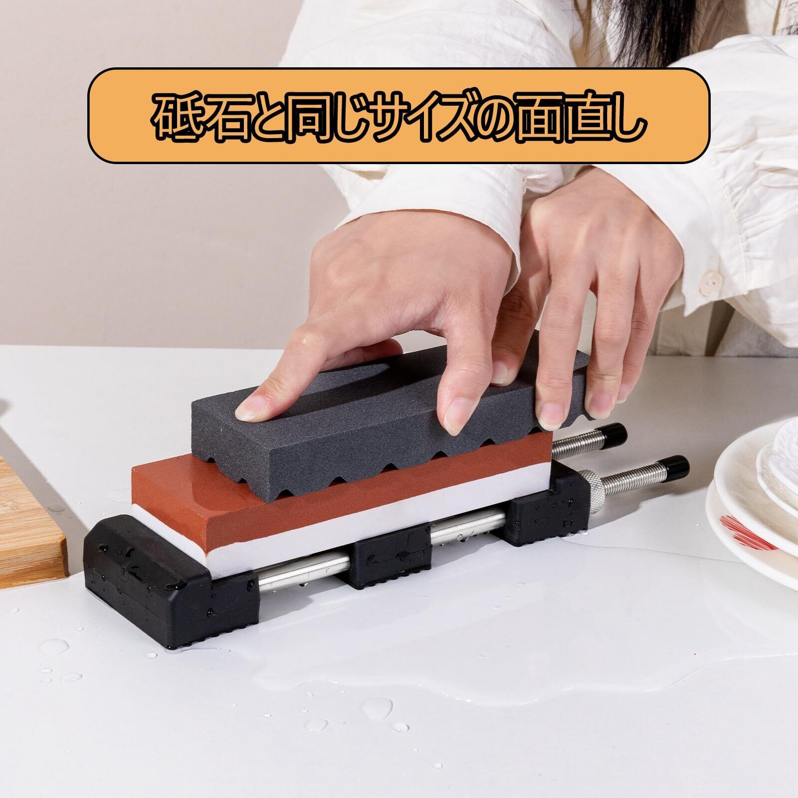 【初心者プロ向き】:この研ぎ石は、角度固定用刀補助具付きのでプロはもちろん、初心者の方でも簡単に使いこなせる。または、万能砥石台つきので、従来のゴムの滑り止めと比べ、研いでいる最中に包丁が手元からずれて大事故になるのを防げます。とても安心てきます。