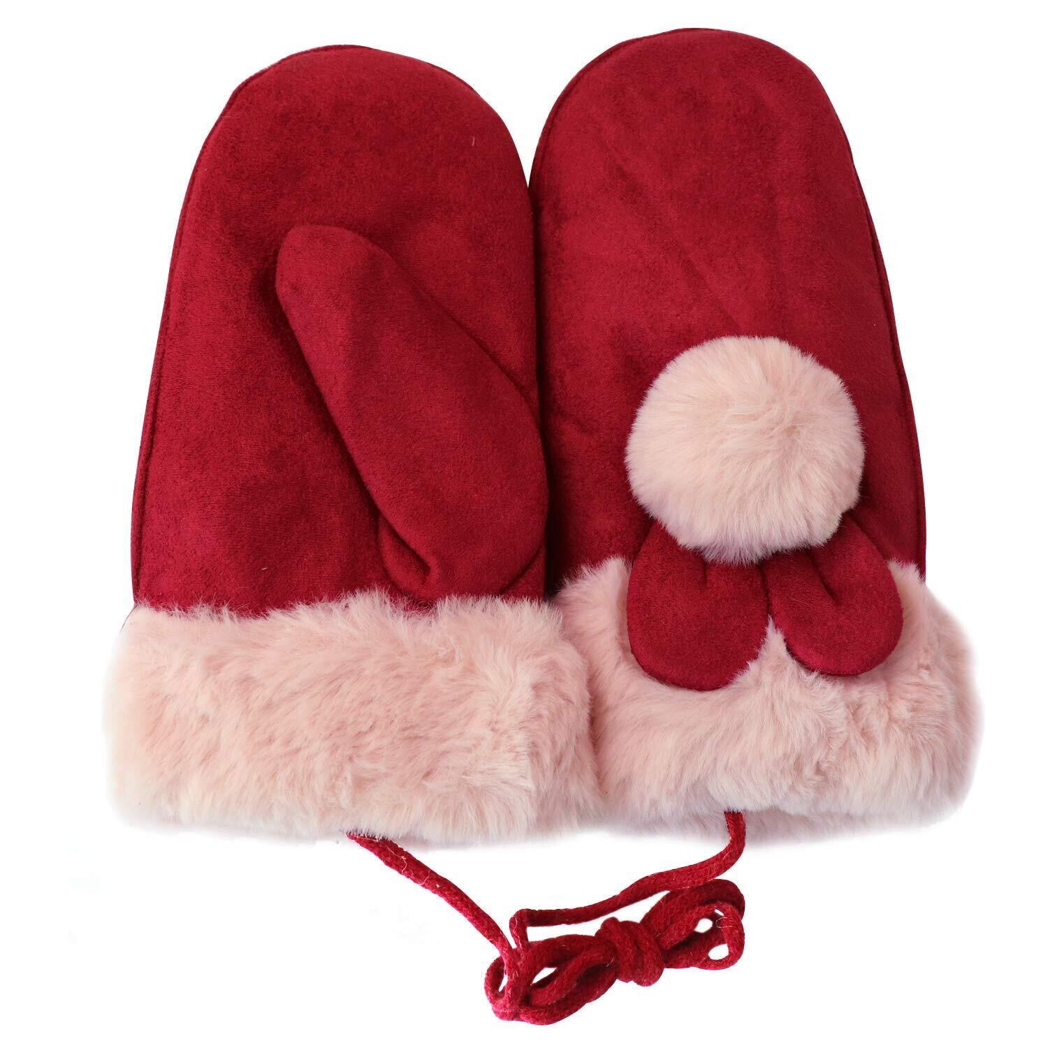 [Eesky] 出品 手袋 ミトン レディース 冬 裏起毛 暖かい 保温 防寒 防風 ふわふわ 可愛い 紐付き 無くす防止 レッド