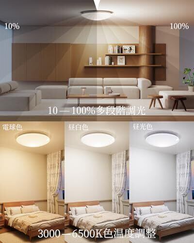 【無段階調光&調色】 リモコンまたはスマホアプリで10%~100%の明るさ調整が可能。色温度も**電球色(暖色)~昼光色(寒色)**まで自由に切り替えられます。シーンや気分に合わせて、リラックスした雰囲気や集中できる光を演出しましょう!