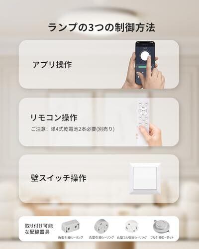 【3つの操作方法に対応】 本製品は、リモコン・スマートフォン・壁スイッチの3つの操作方法に対応し、便利に照明をコントロールできます。 スマートフォン操作:専用アプリを使用して、調光・調色・タイマー設定などを自由に調整可能。 リモコン操作:点灯・消灯はもちろん、長押しで無段階の調光・調色が可能。さらに、最大明るさやタイマー機能(15分/30分)も搭載。 壁スイッチの注意点:壁スイッチを素早く切り替えると、昼白色 → 昼光色 → 電球色 → 夜灯の順に切り替わります。お好みの明るさに調整する際はご注意ください。